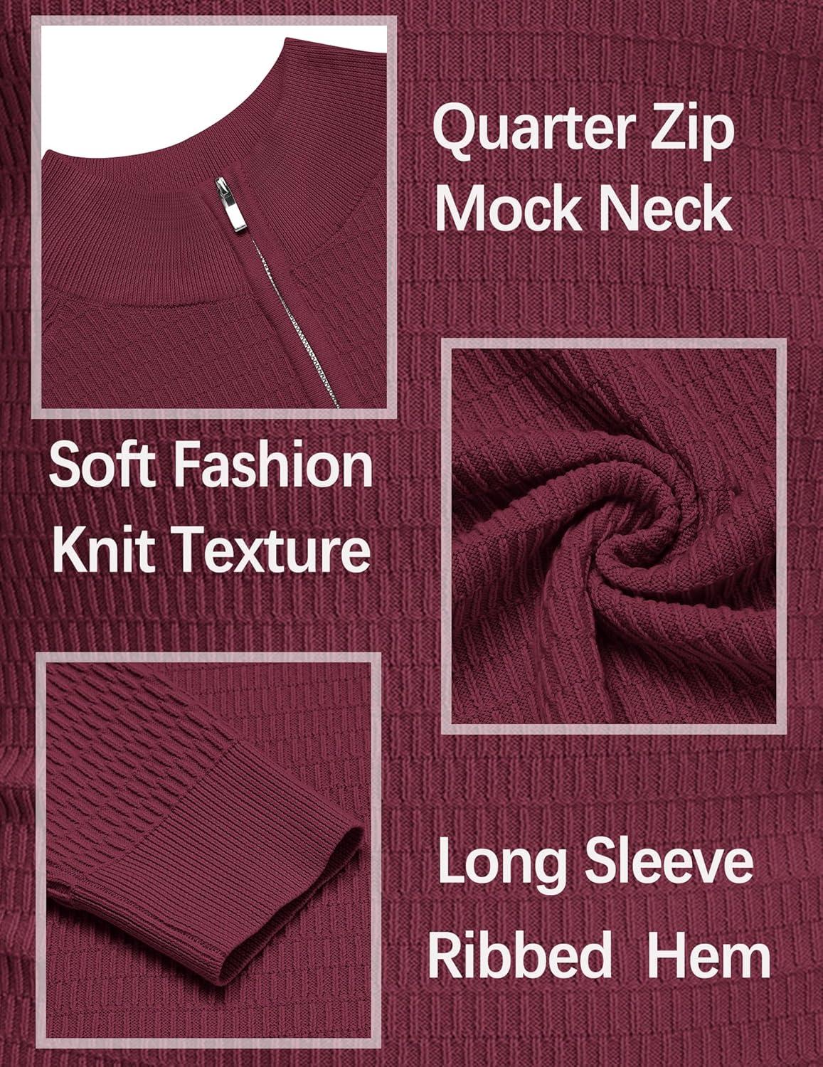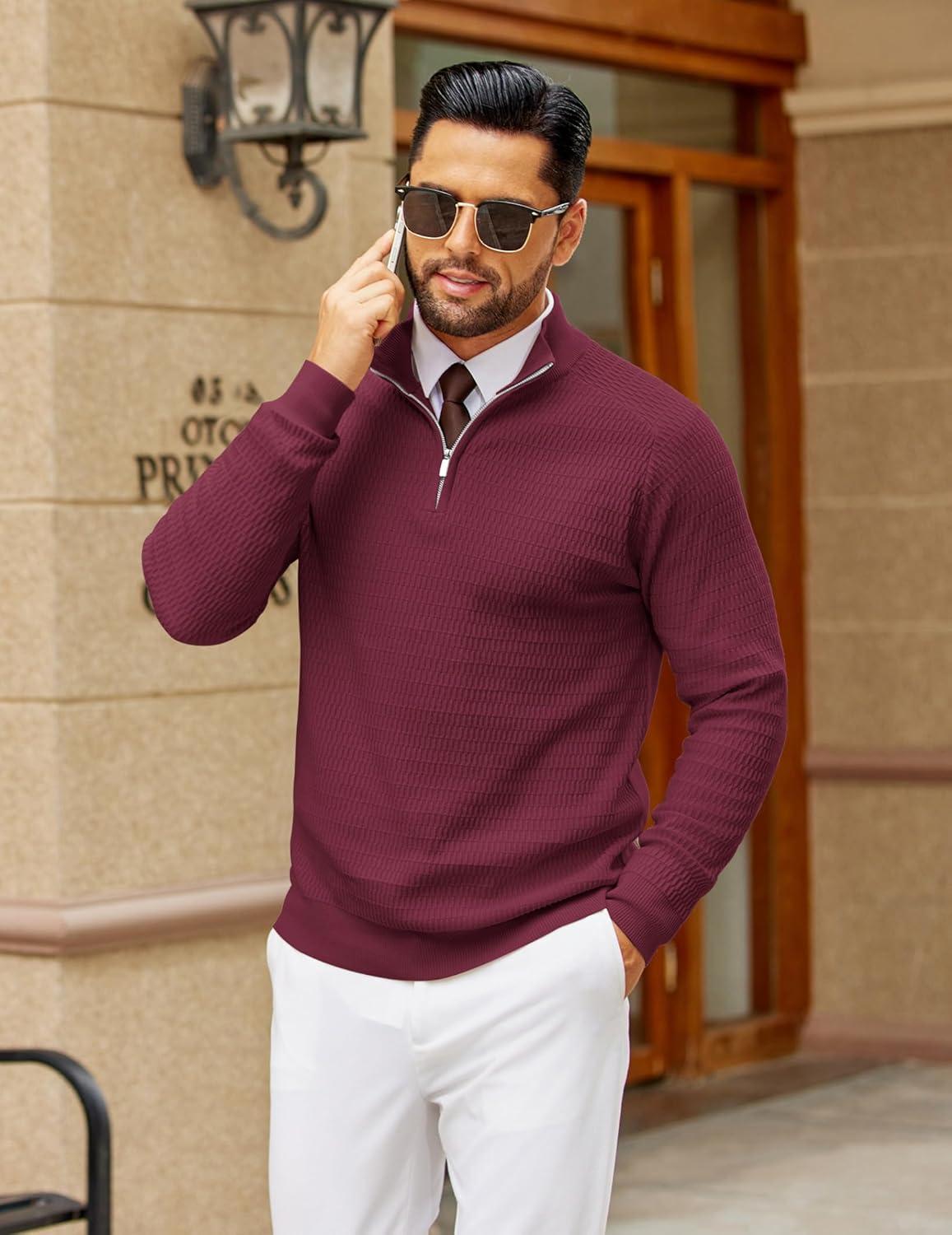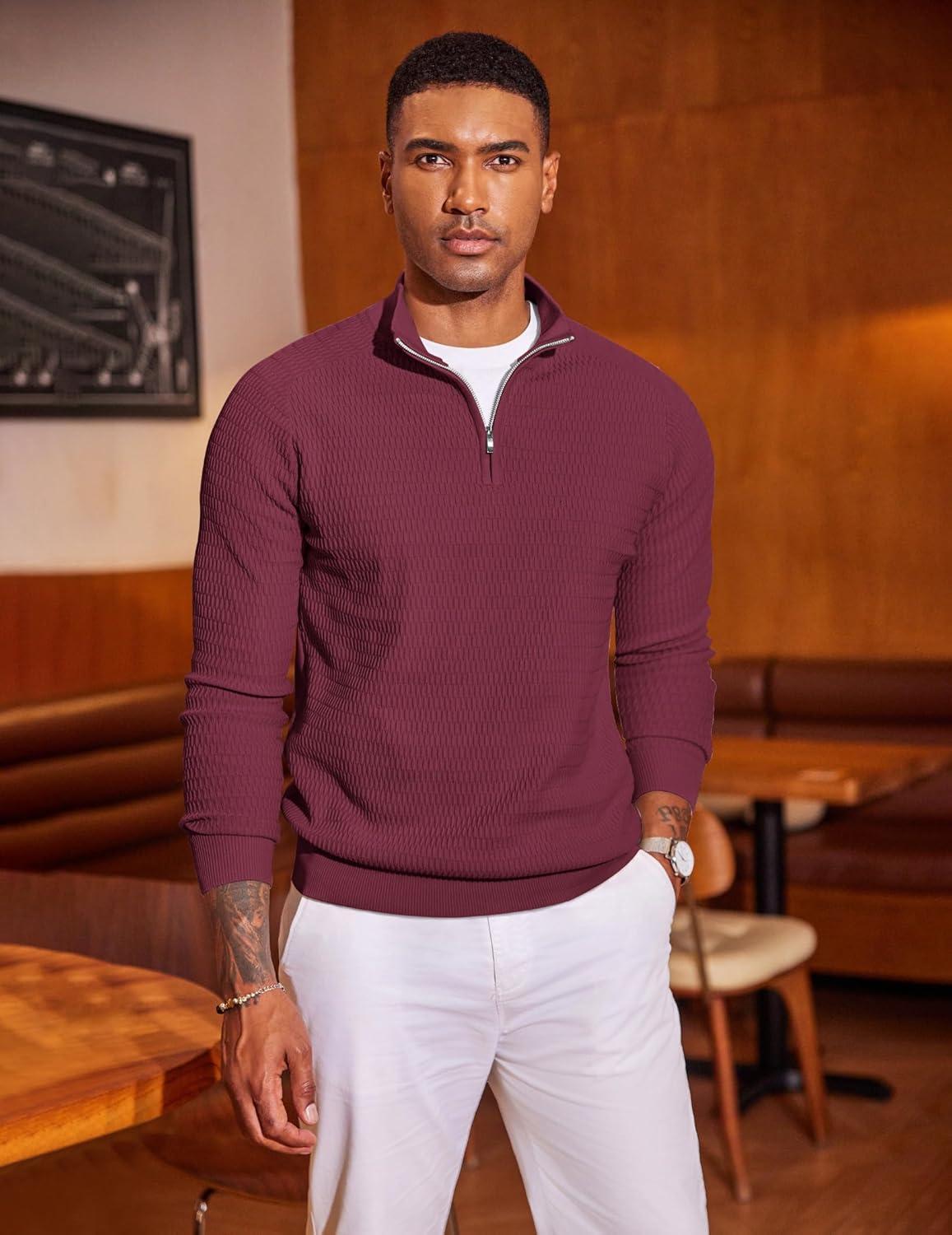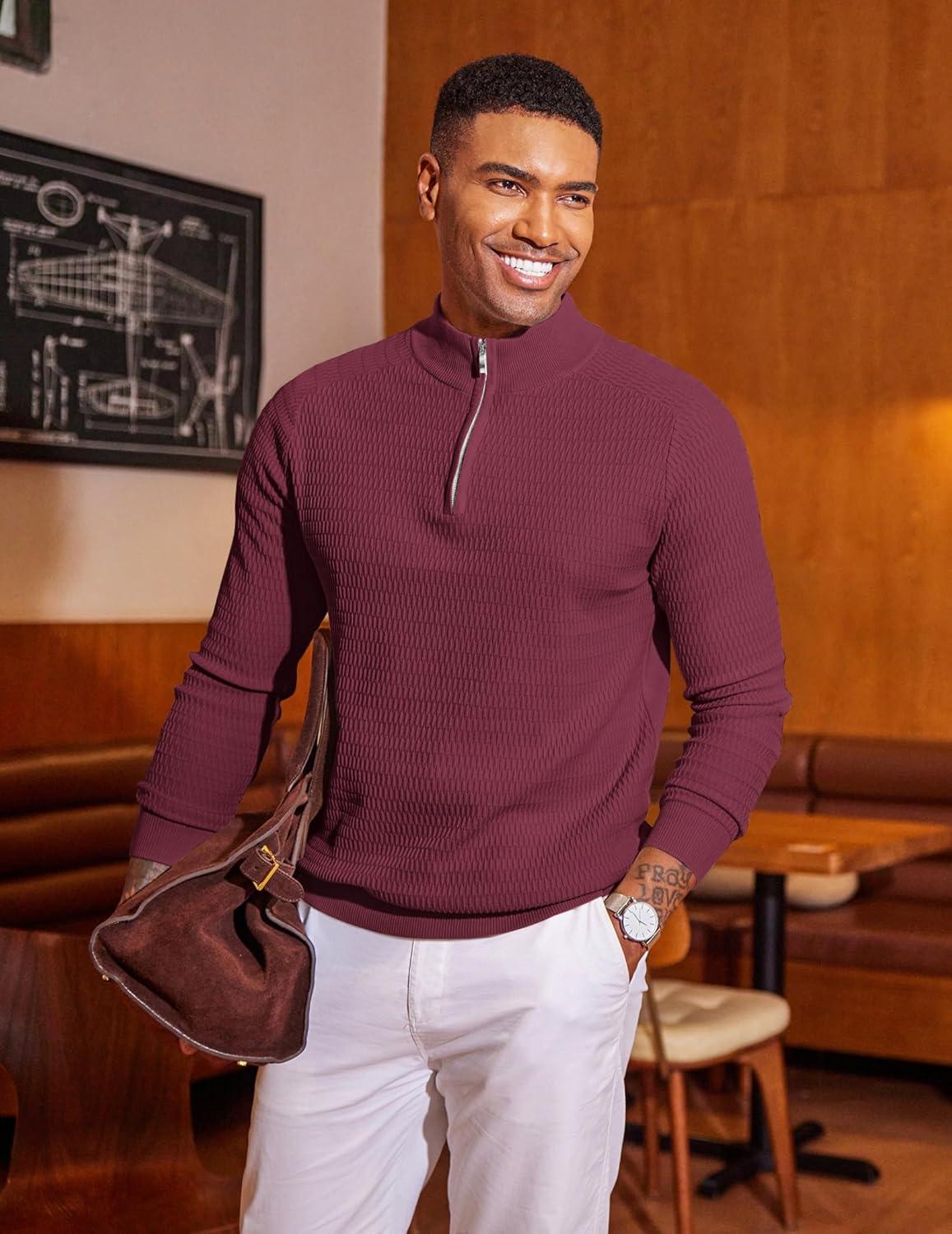 COOFANDY Men’s Quarter Zip Sweater Slim Fit Lightweight Mock Neck Pullover Knit Texture Polo Sweaters(Wine Red)