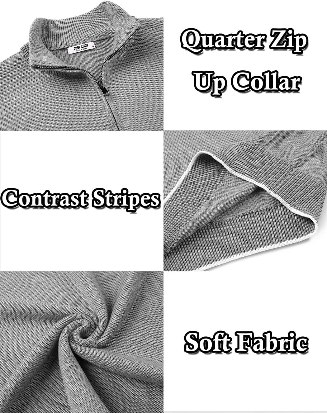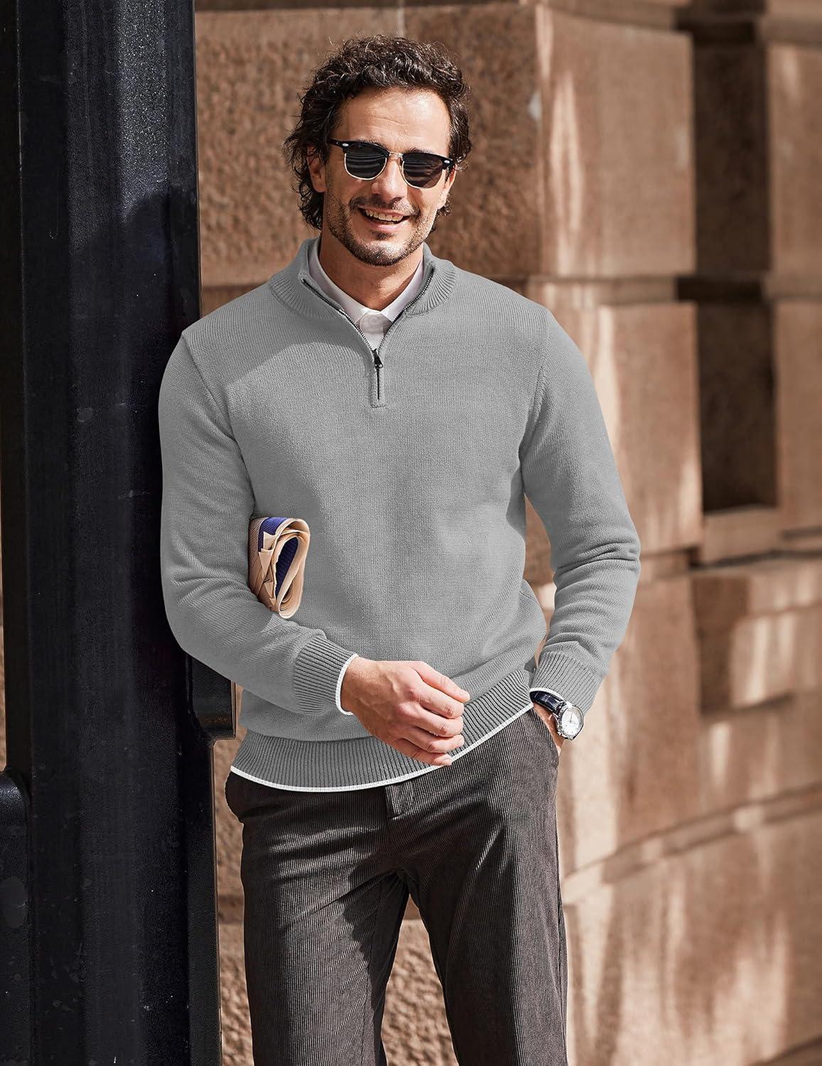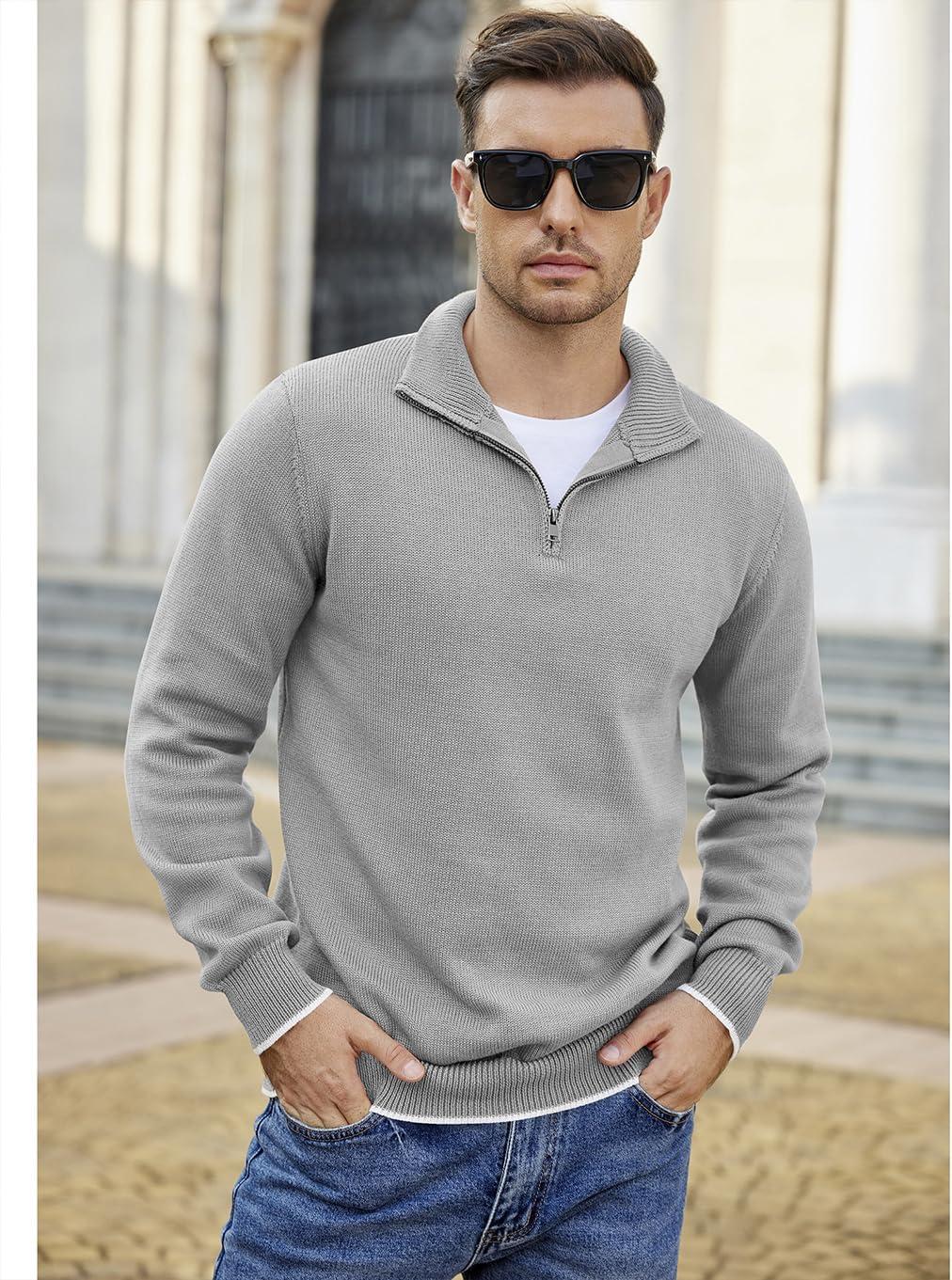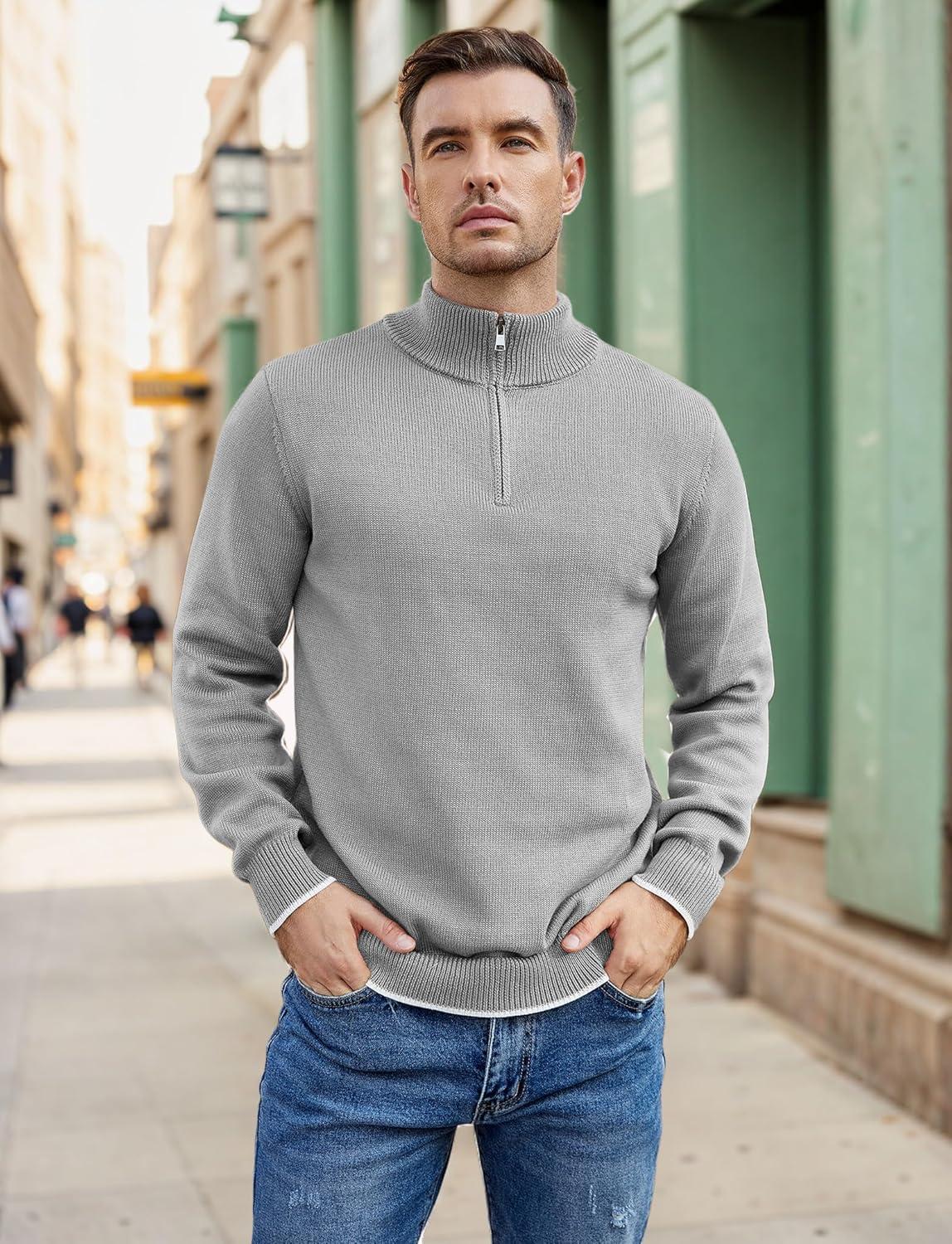 COOFANDY Men’s Quarter Zip Up Pullover Slim Fit Lightweight Mock Neck Long Sleeve Sweaters(Light Gray)
