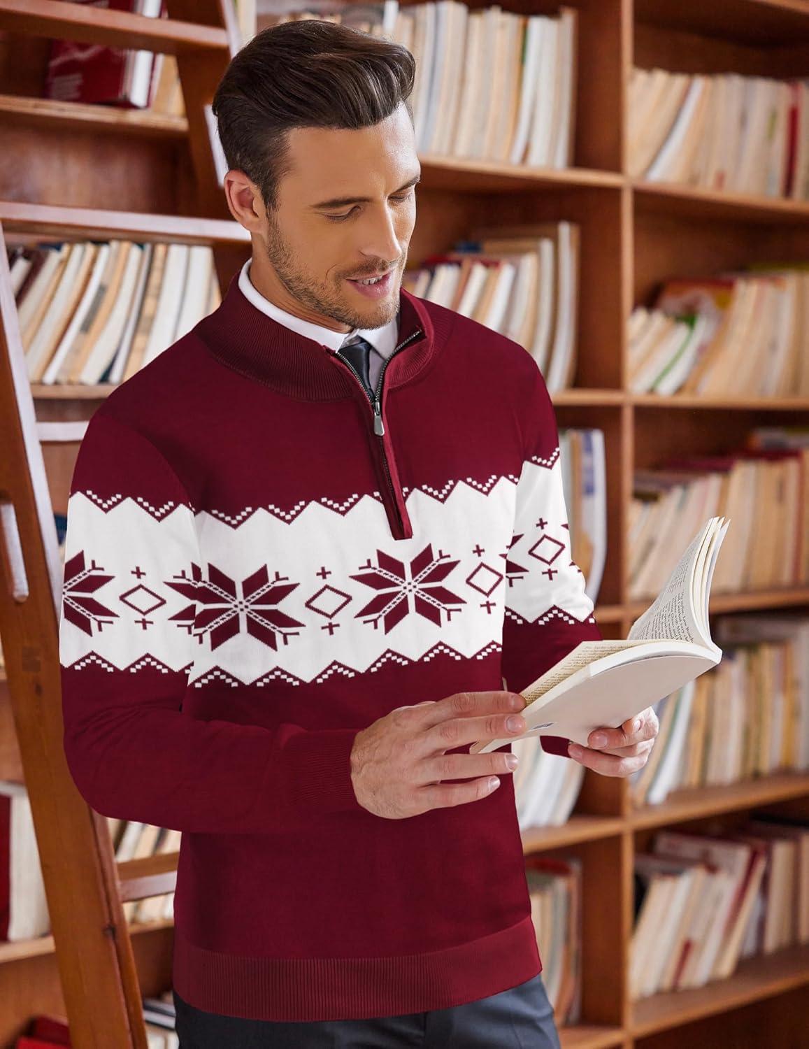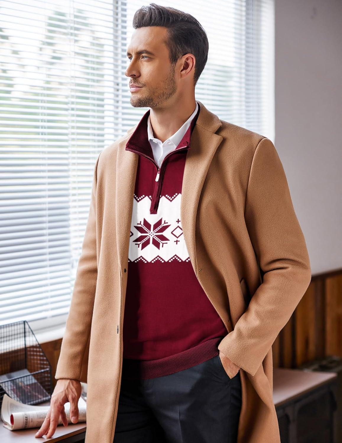 COOFANDY Men’s Quarter Zip Up Sweaters Slim Fit Lightweight Mock Neck Pullover Casual Polo Sweaters(Christmas Red & Elk)