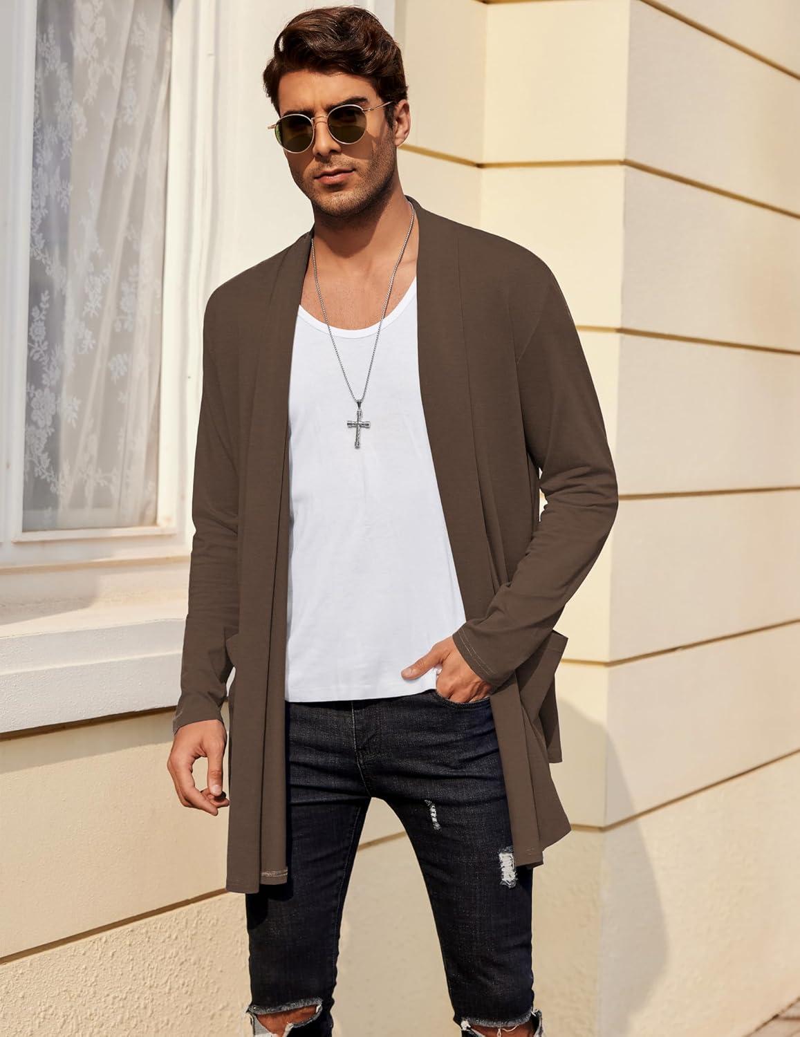 COOFANDY Men’s Ruffle Shawl Collar Cardigan Open Front Lightweight Long Length Drape Cape Overcoat with Pockets(Coffe)