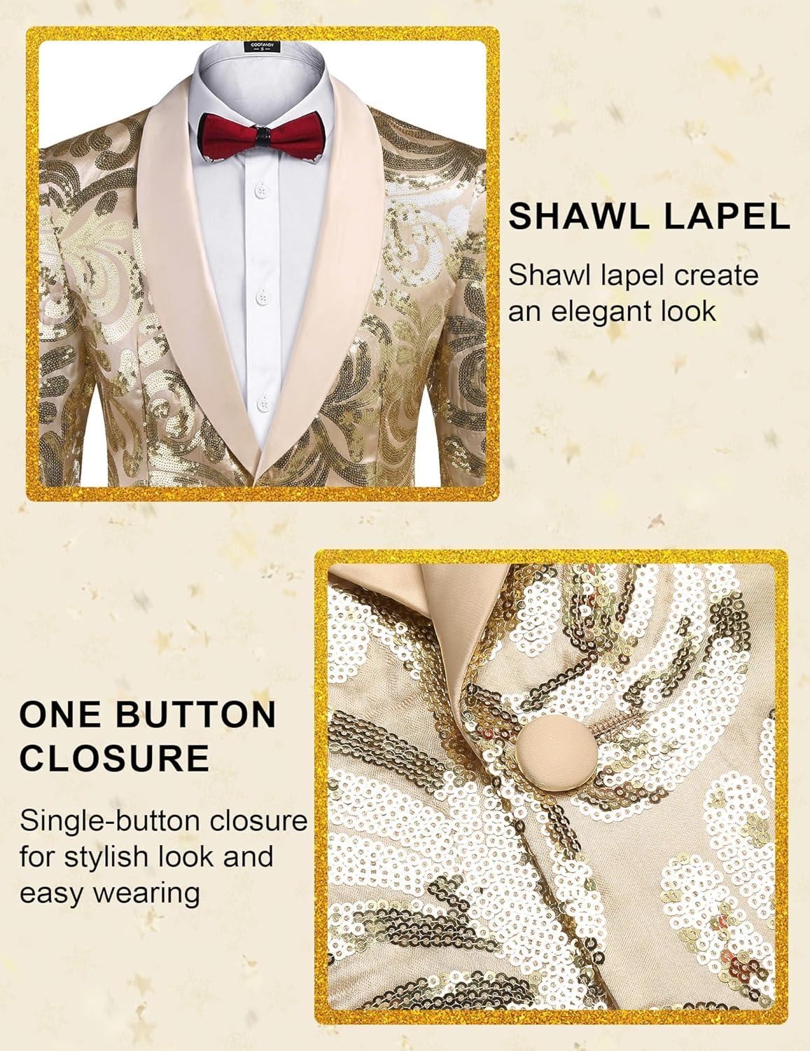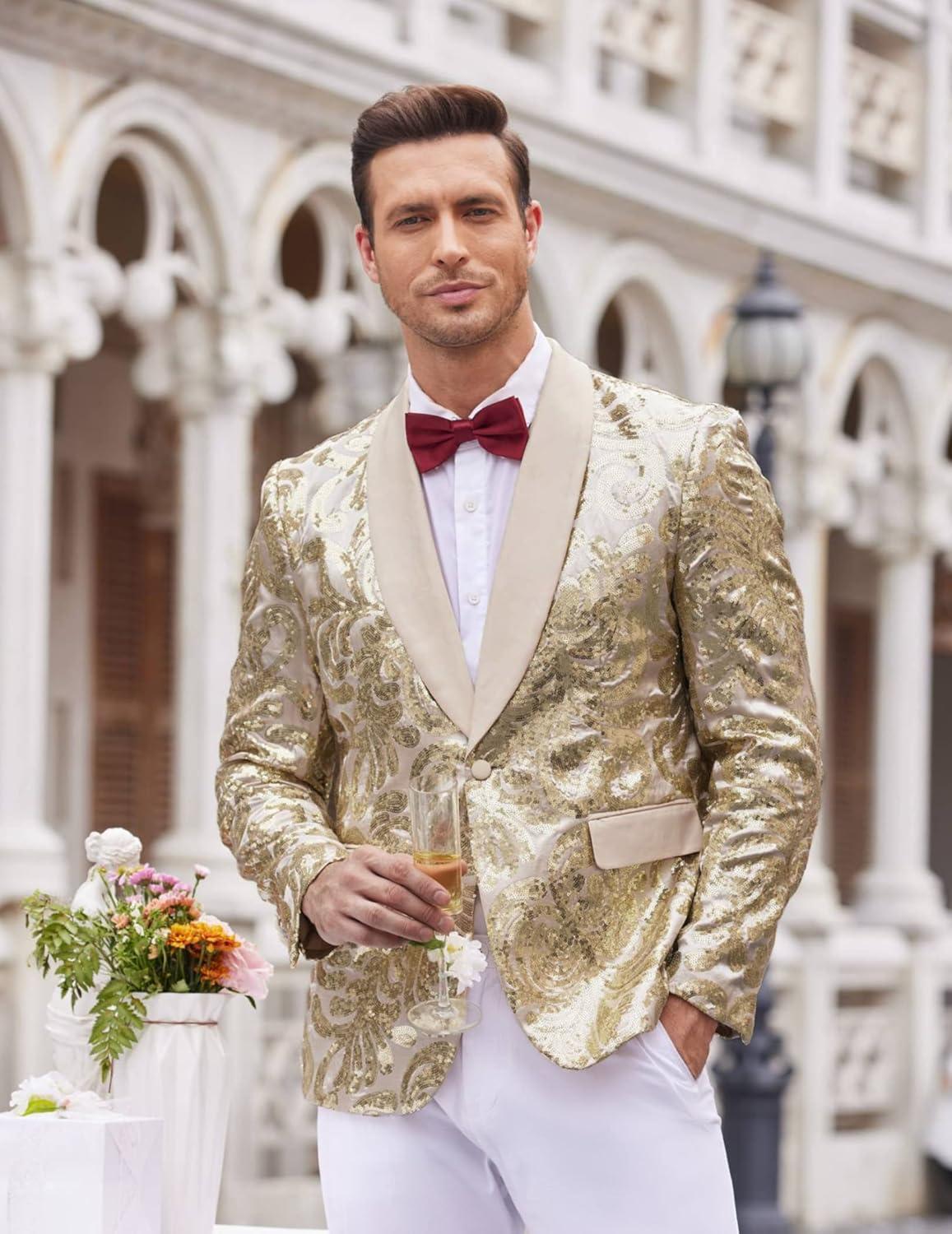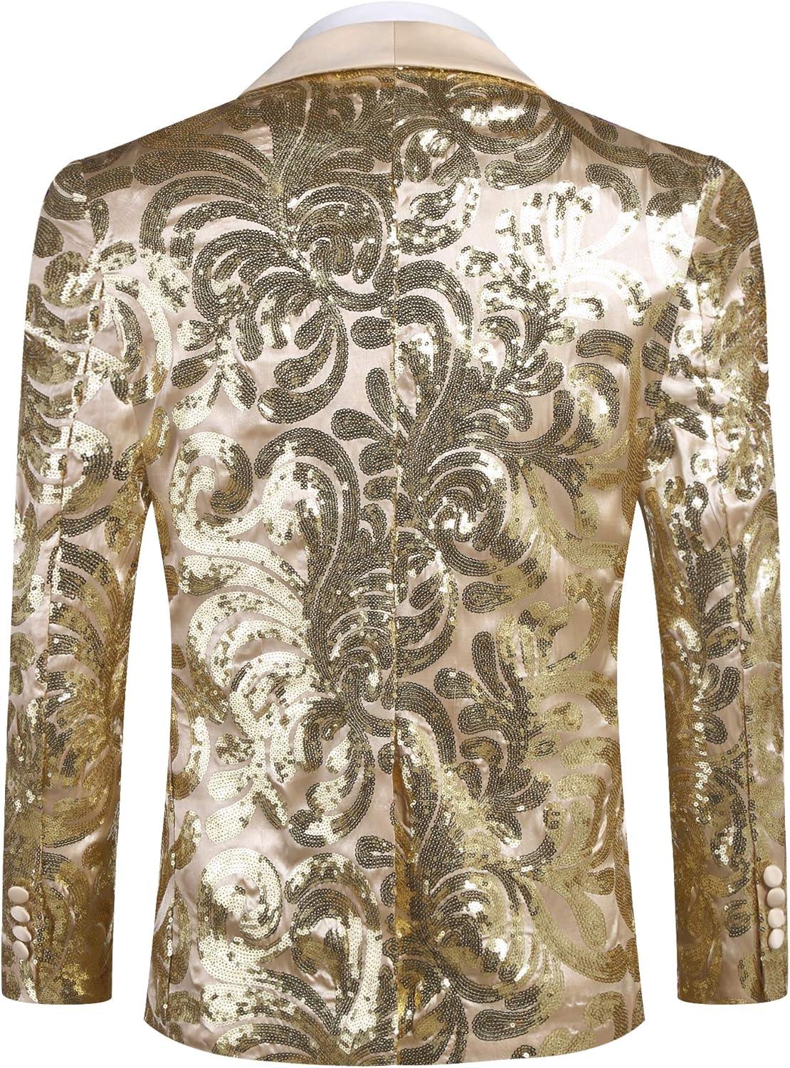 COOFANDY Men’s Sequin Blazer Sparkly Glitter Jacket Shiny Floral Suit Jacket Stylish Party Wedding Banquet Prom Tuxedo(Light Gold)