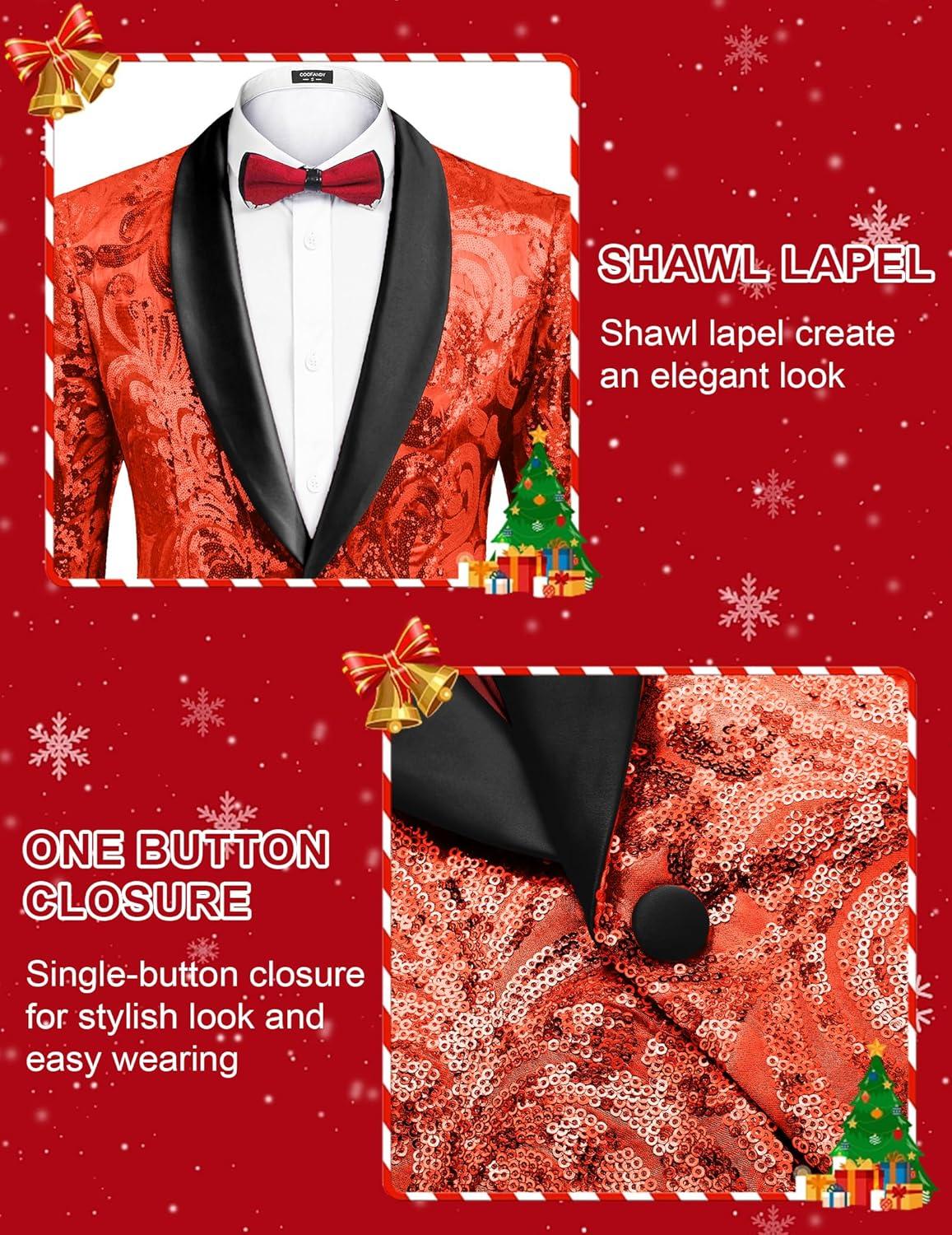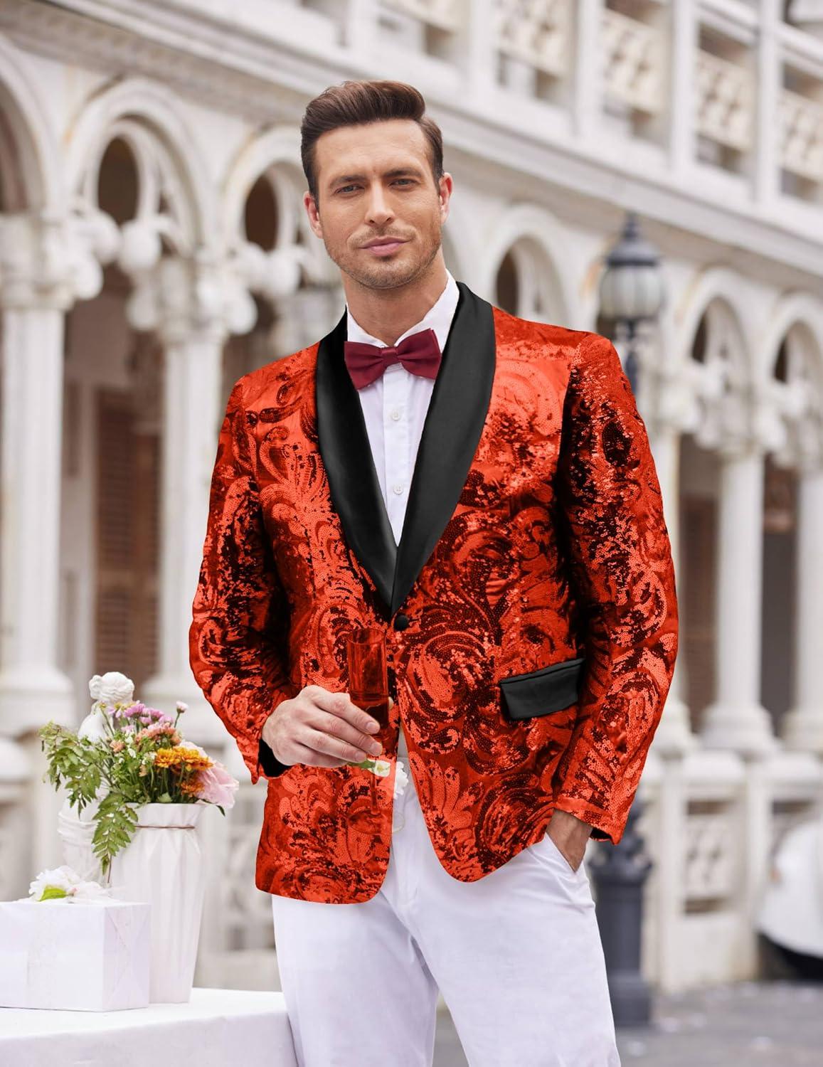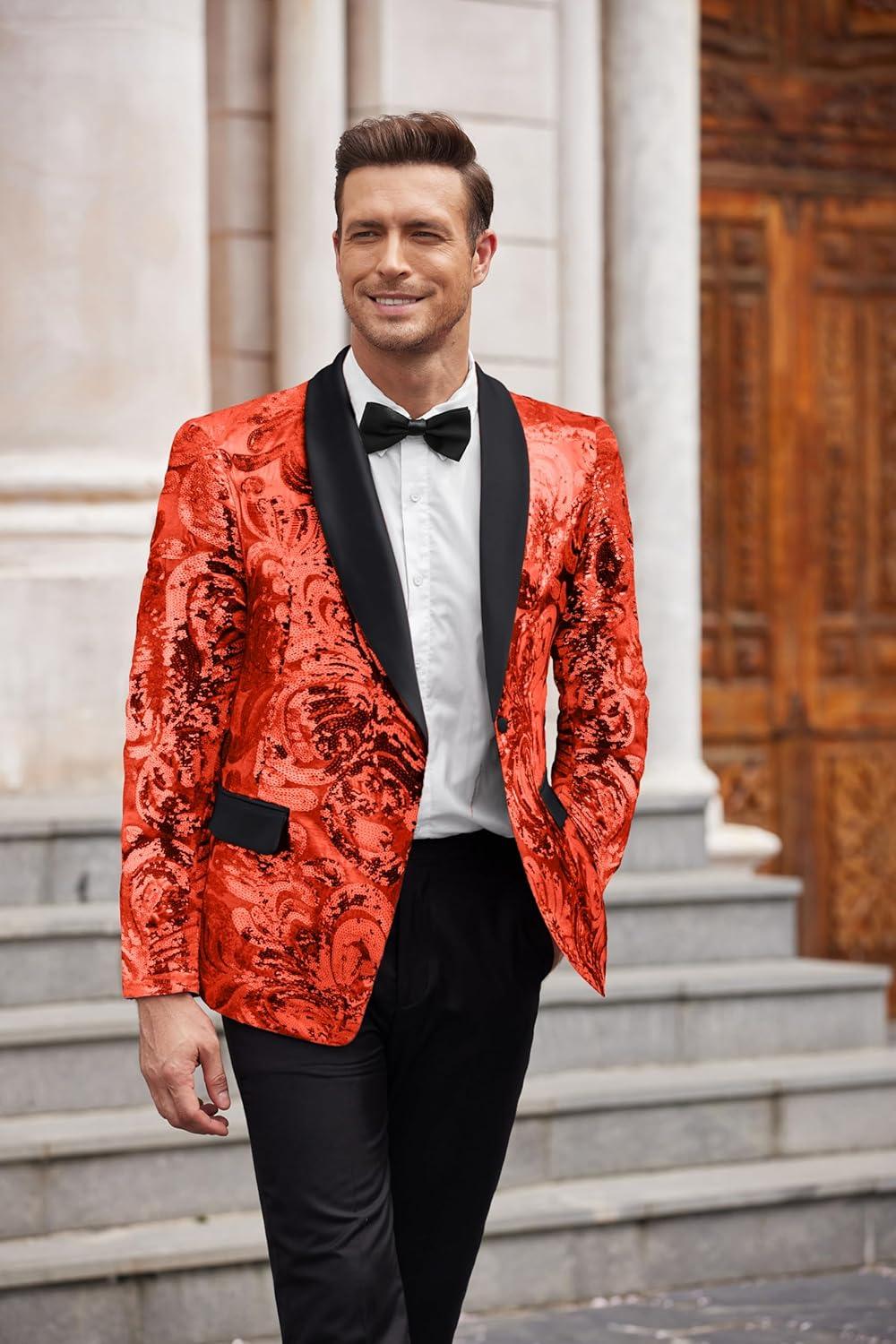 COOFANDY Men’s Sequin Blazer Sparkly Glitter Jacket Shiny Floral Suit Jacket Stylish Party Wedding Banquet Prom Tuxedo(Red – Black Lapel)