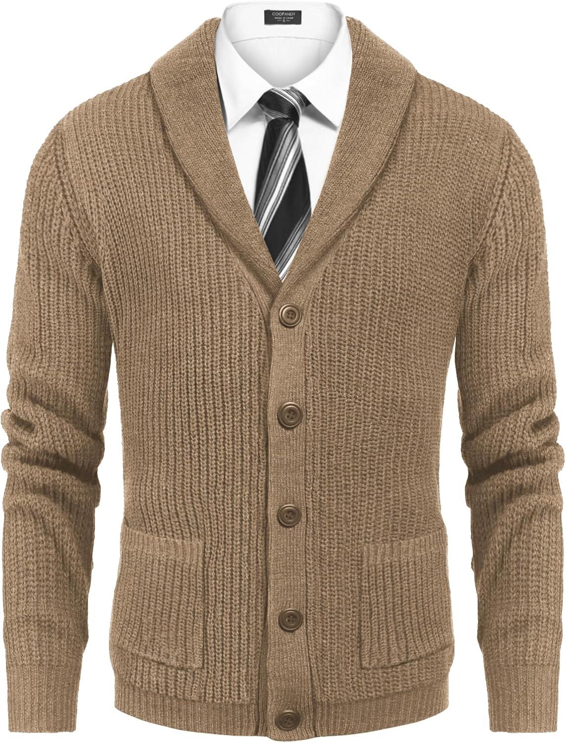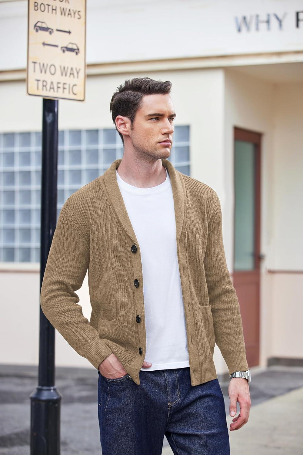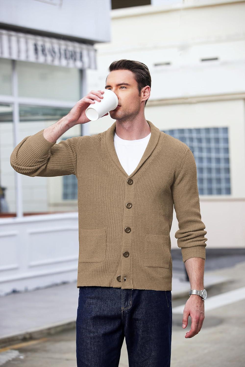 COOFANDY Men’s Shawl Collar Cardigan Sweater Slim Fit Cable Knit Button up Sweater with Pockets(Camel)