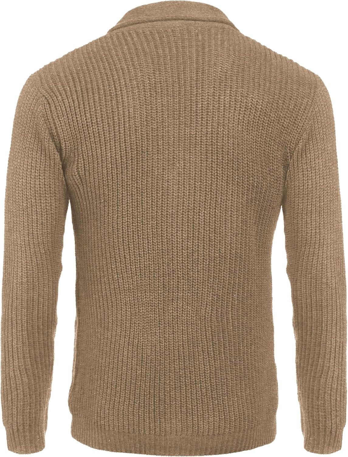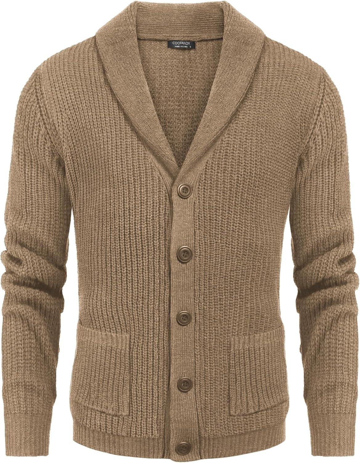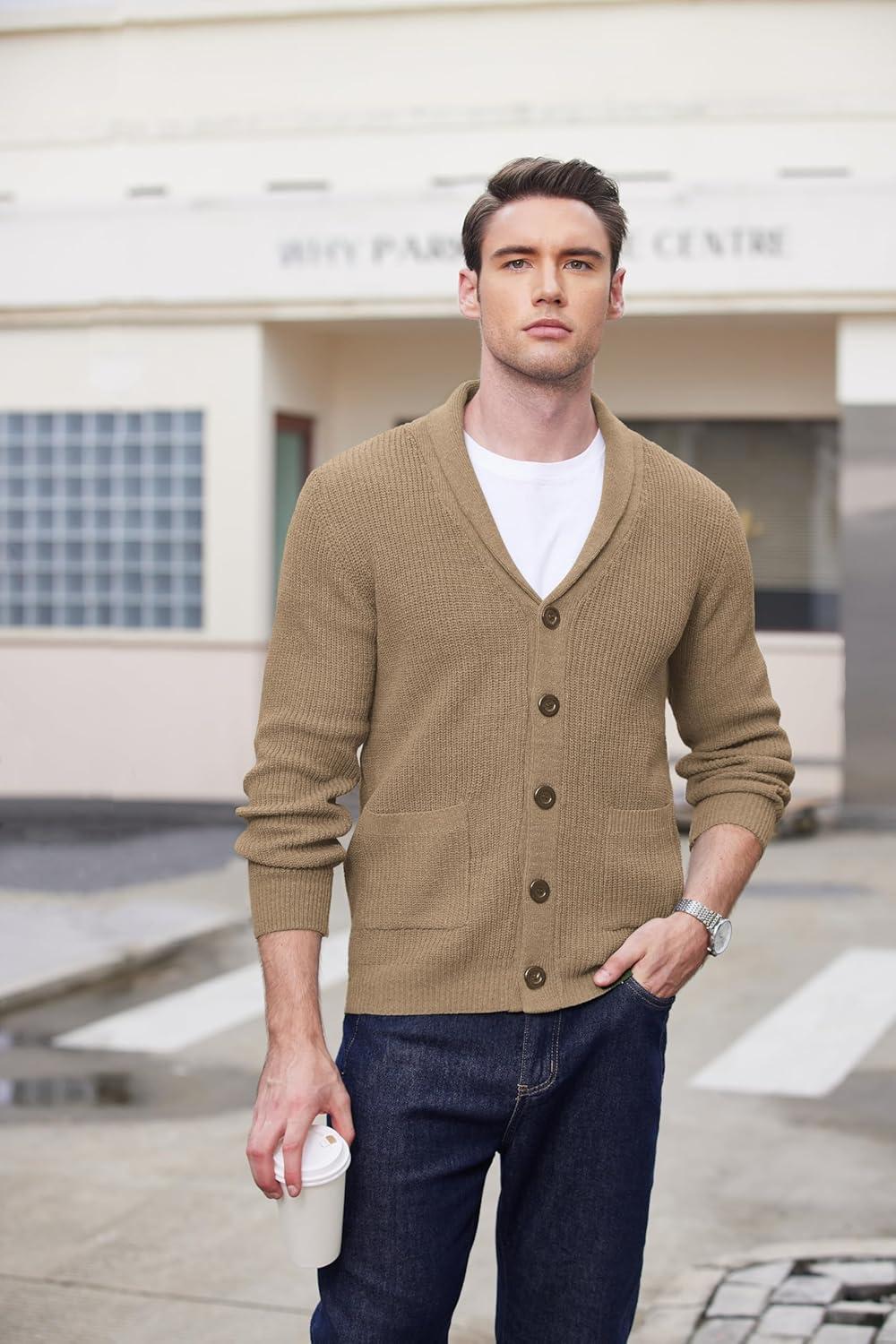 COOFANDY Men’s Shawl Collar Cardigan Sweater Slim Fit Cable Knit Button up Sweater with Pockets(Camel)