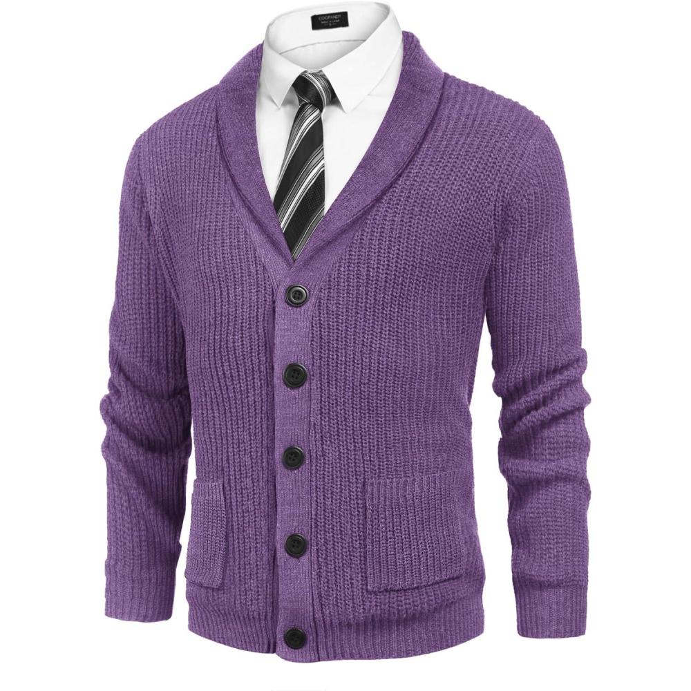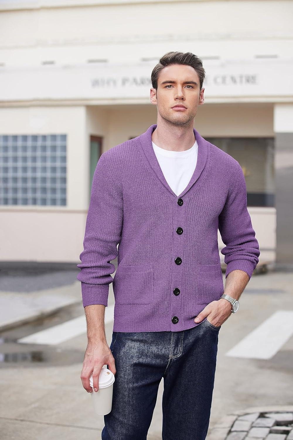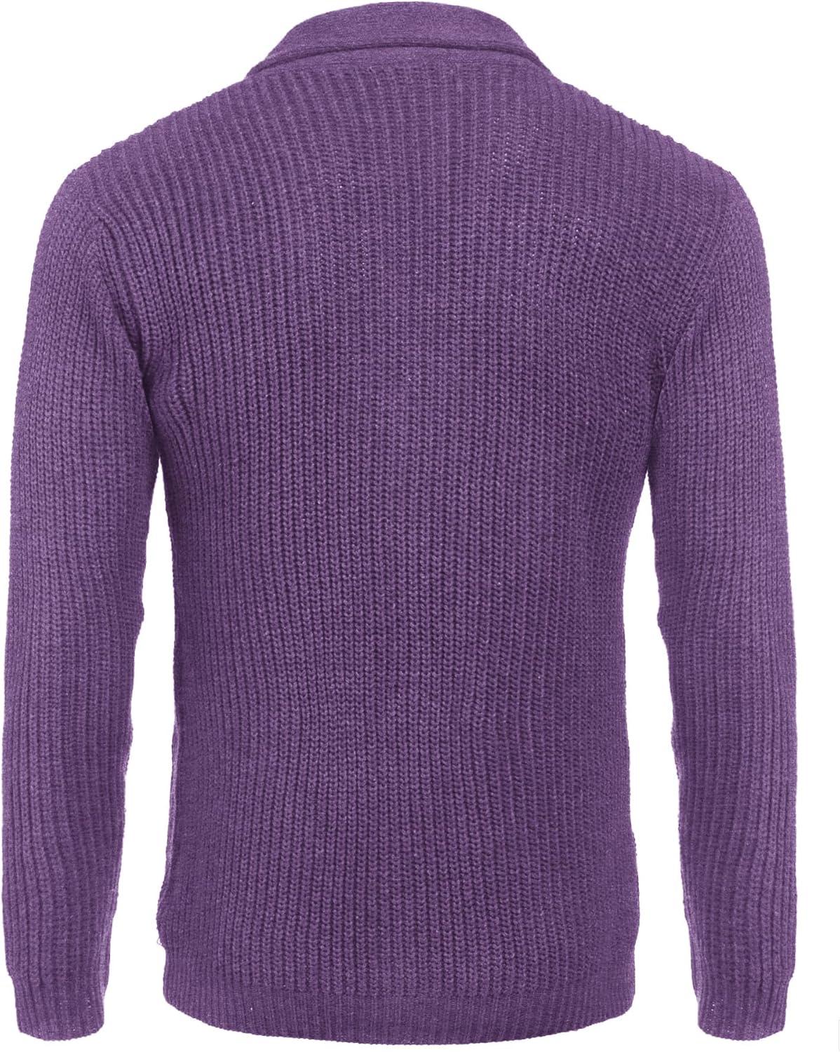 COOFANDY Men’s Shawl Collar Cardigan Sweater Slim Fit Cable Knit Button up Sweater with Pockets(Purple)