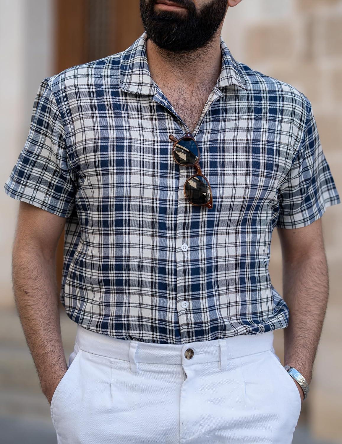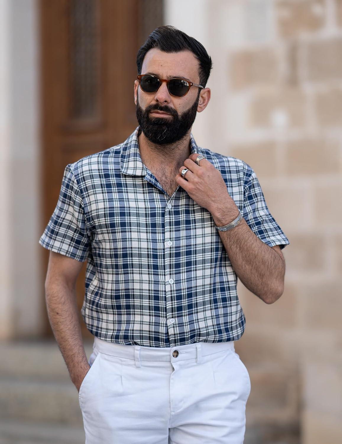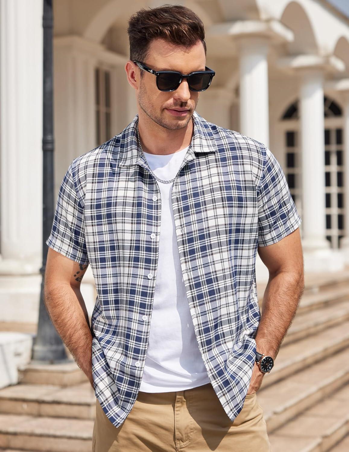 COOFANDY Mens Short Sleeve Button Down Shirt Plaid Button Up Shirts Casual 75% Cotton Work Shirts(Blue&white)