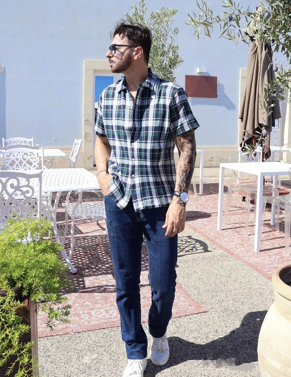 imageCOOFANDY Mens Short Sleeve Button Down Shirt Plaid Button Up Shirts Casual 75 Cotton Work ShirtsGreenblue