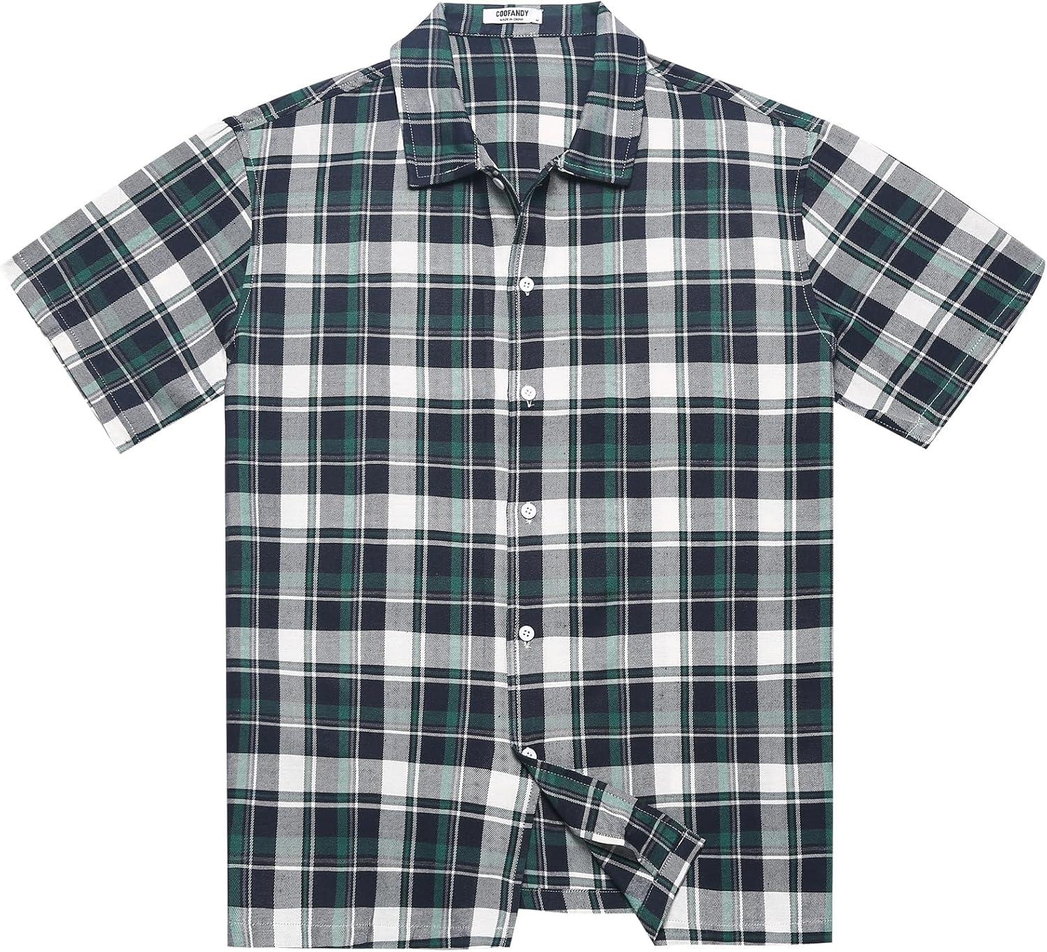 COOFANDY Mens Short Sleeve Button Down Shirt Plaid Button Up Shirts Casual 75% Cotton Work Shirts(Dark Green&white)