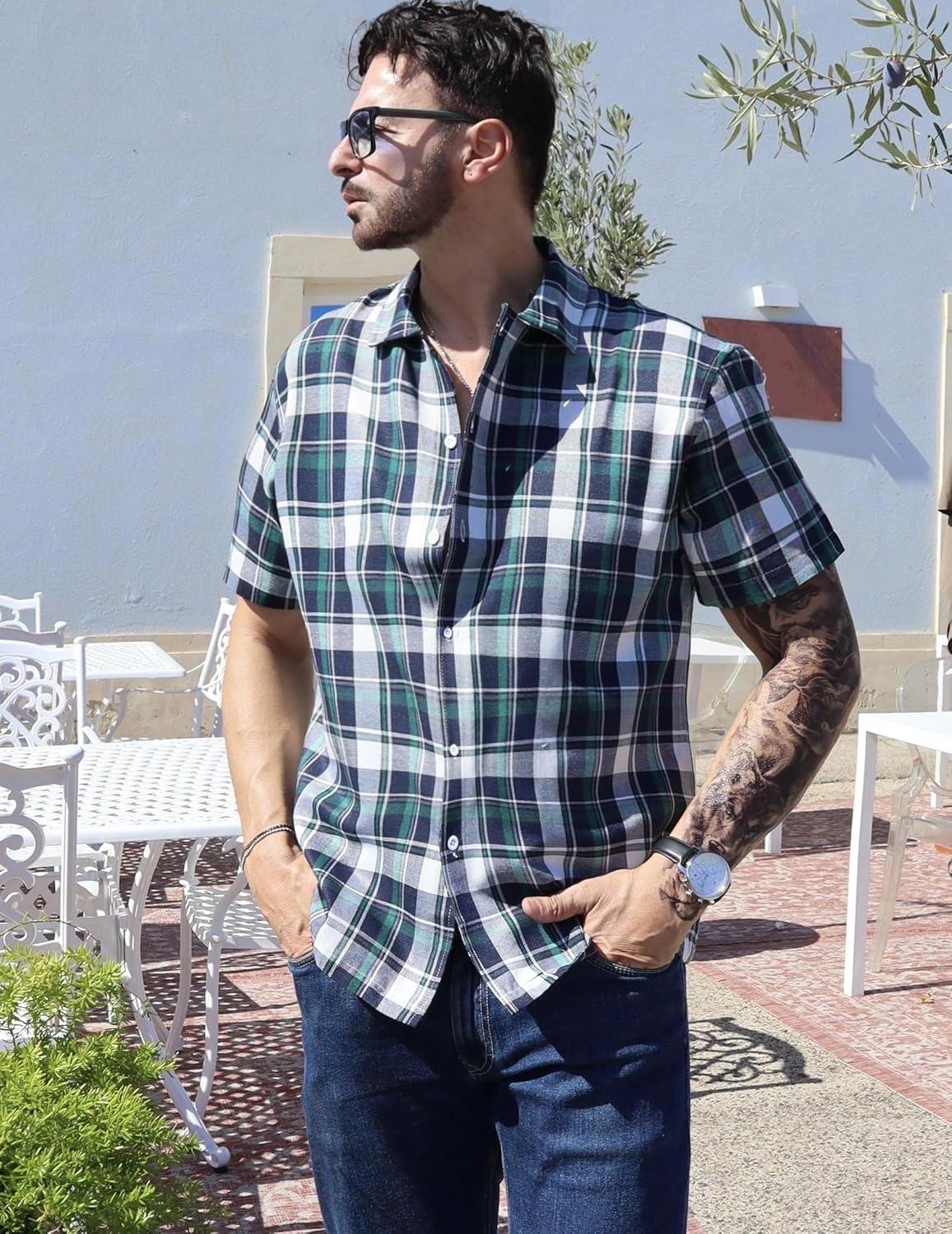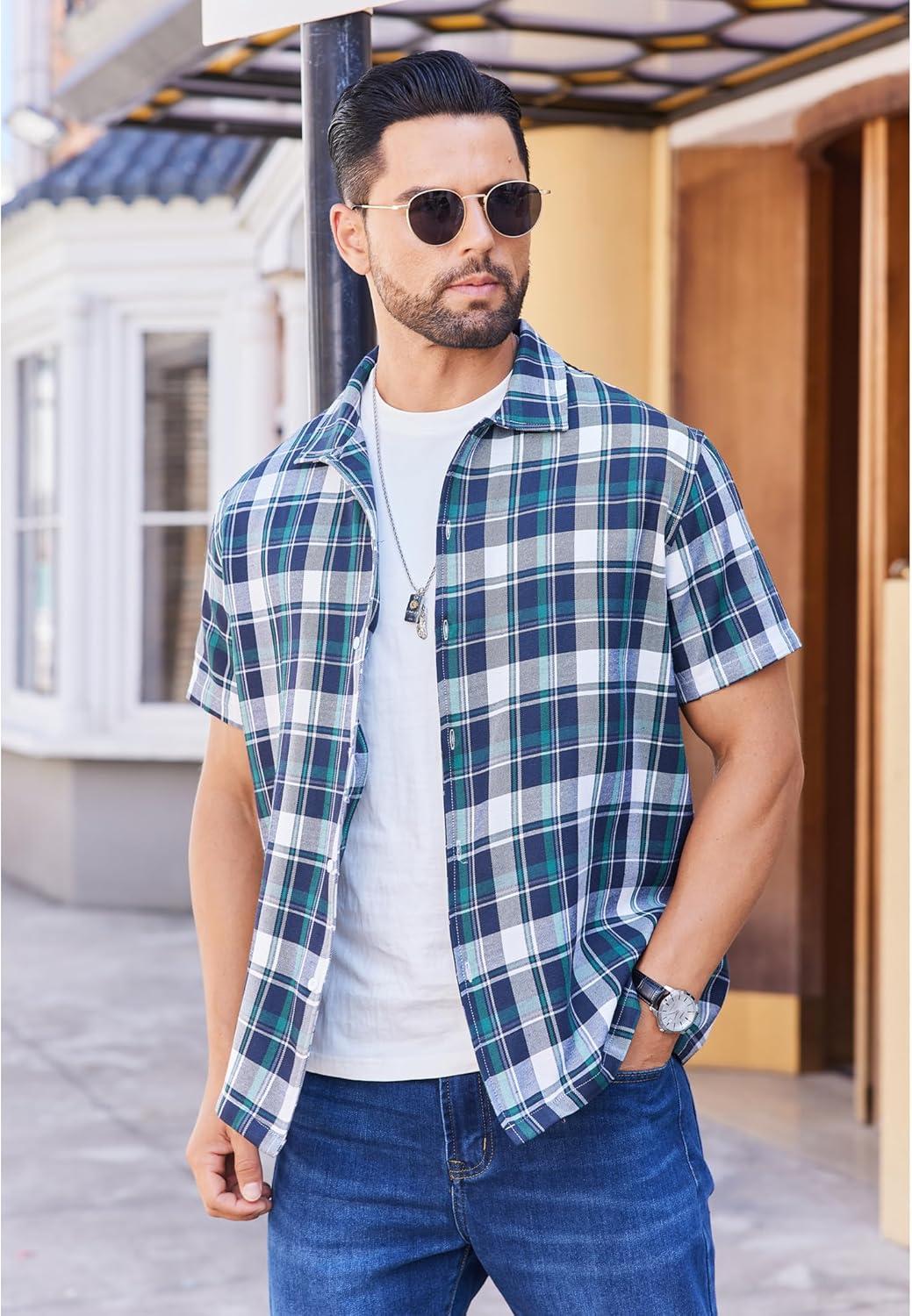 COOFANDY Mens Short Sleeve Button Down Shirt Plaid Button Up Shirts Casual 75% Cotton Work Shirts(Green&blue)
