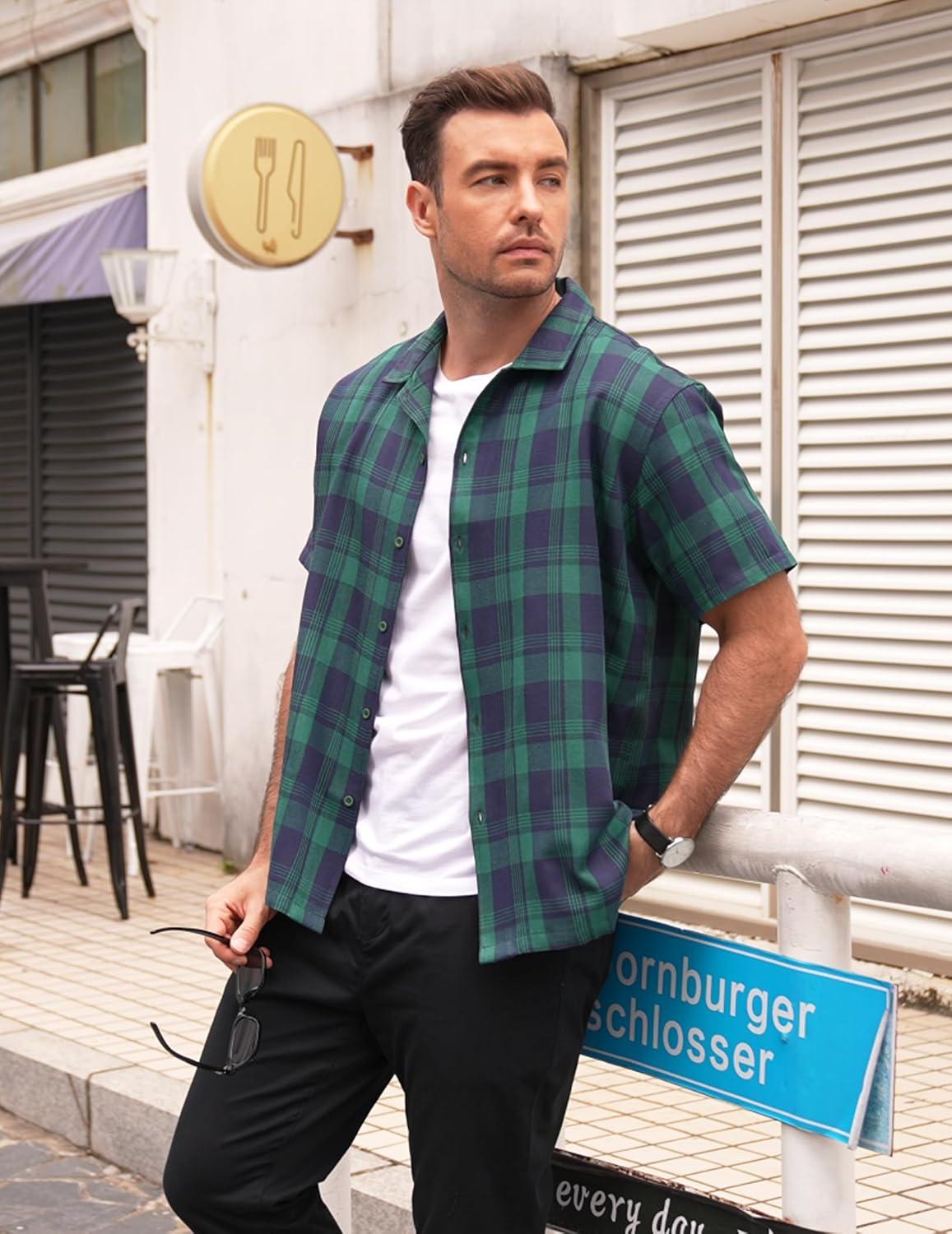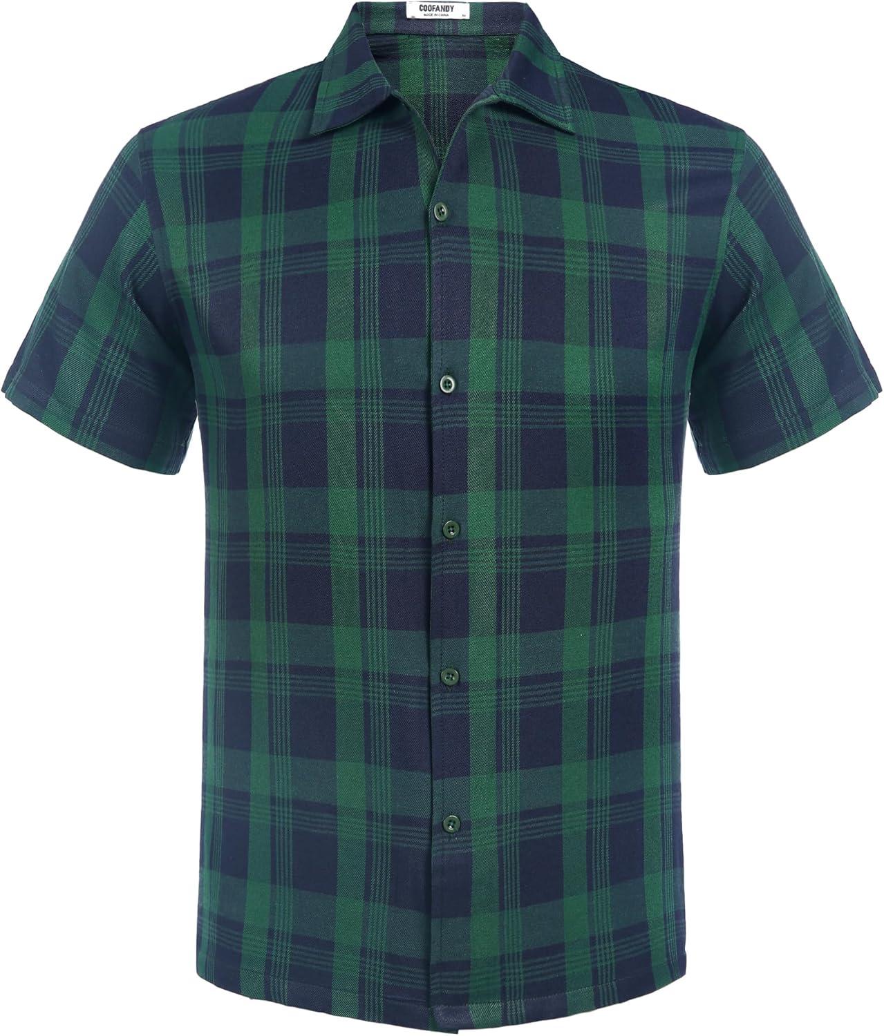COOFANDY Mens Short Sleeve Button Down Shirt Plaid Button Up Shirts Casual 75% Cotton Work Shirts(Green&blue)