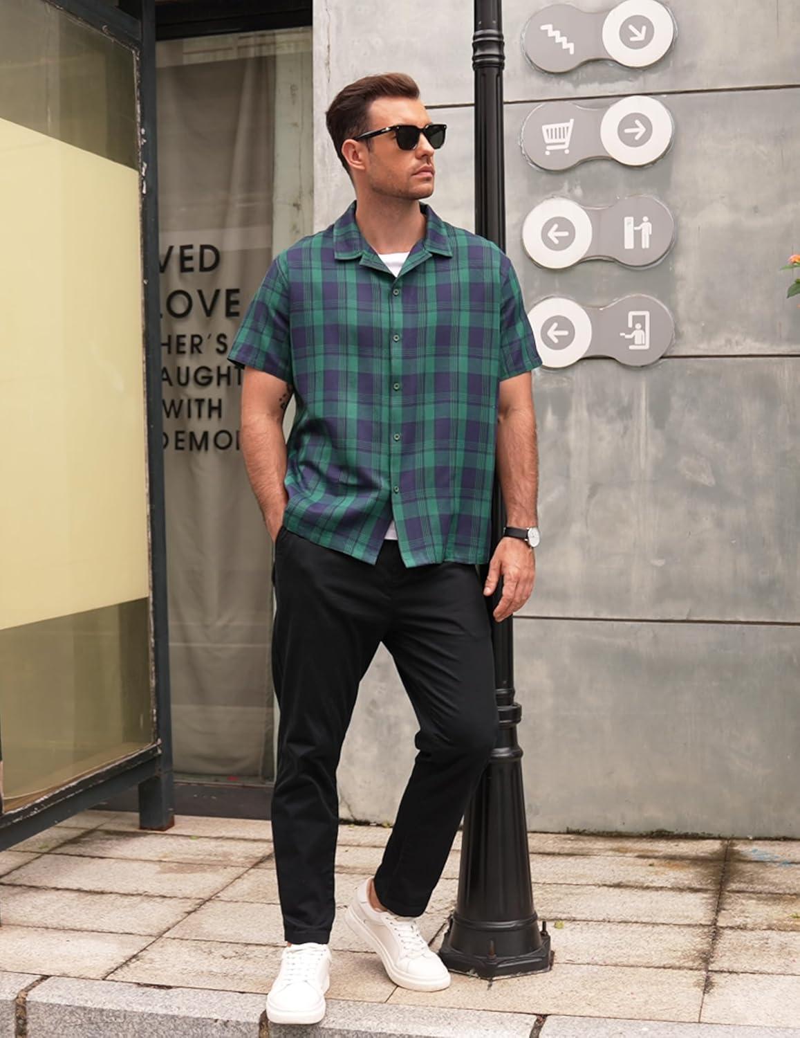 COOFANDY Mens Short Sleeve Button Down Shirt Plaid Button Up Shirts Casual 75% Cotton Work Shirts(Dark Green&white)