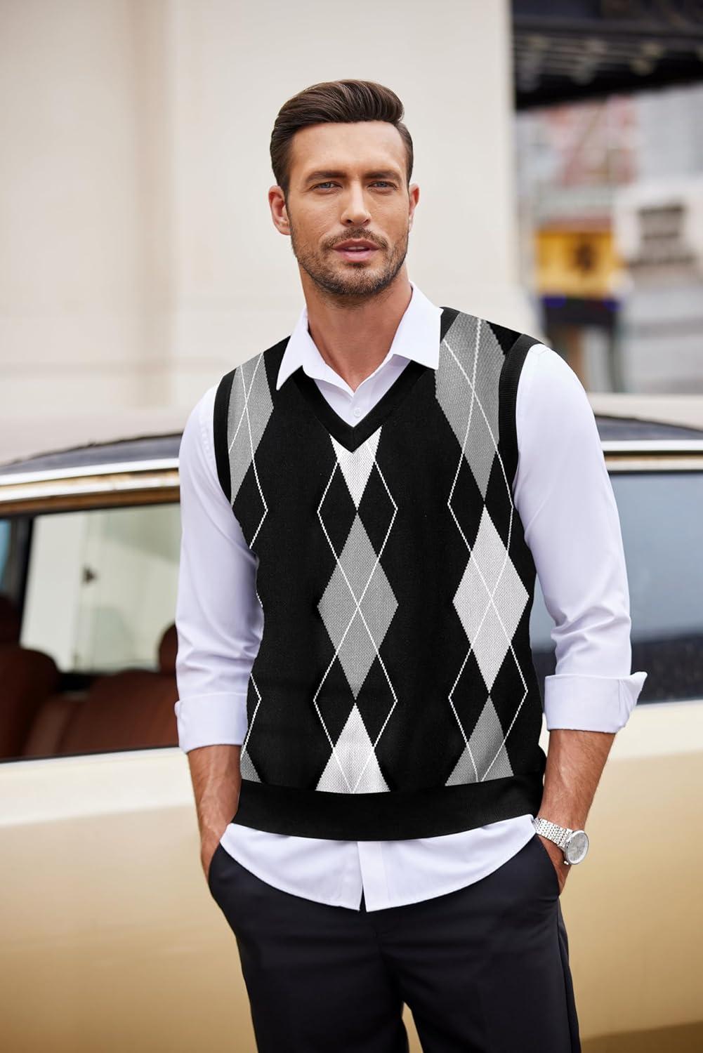 COOFANDY Men’s Sleeveless V Neck Pullover Sweater Slim Fit Casual Argyle Sweater Vest(Gw262 Black and Gray Plaid)