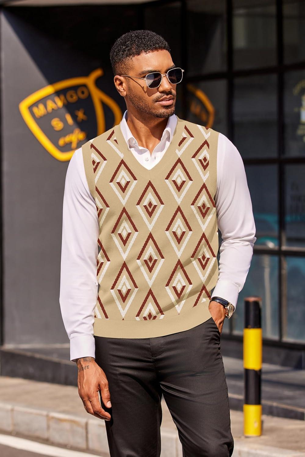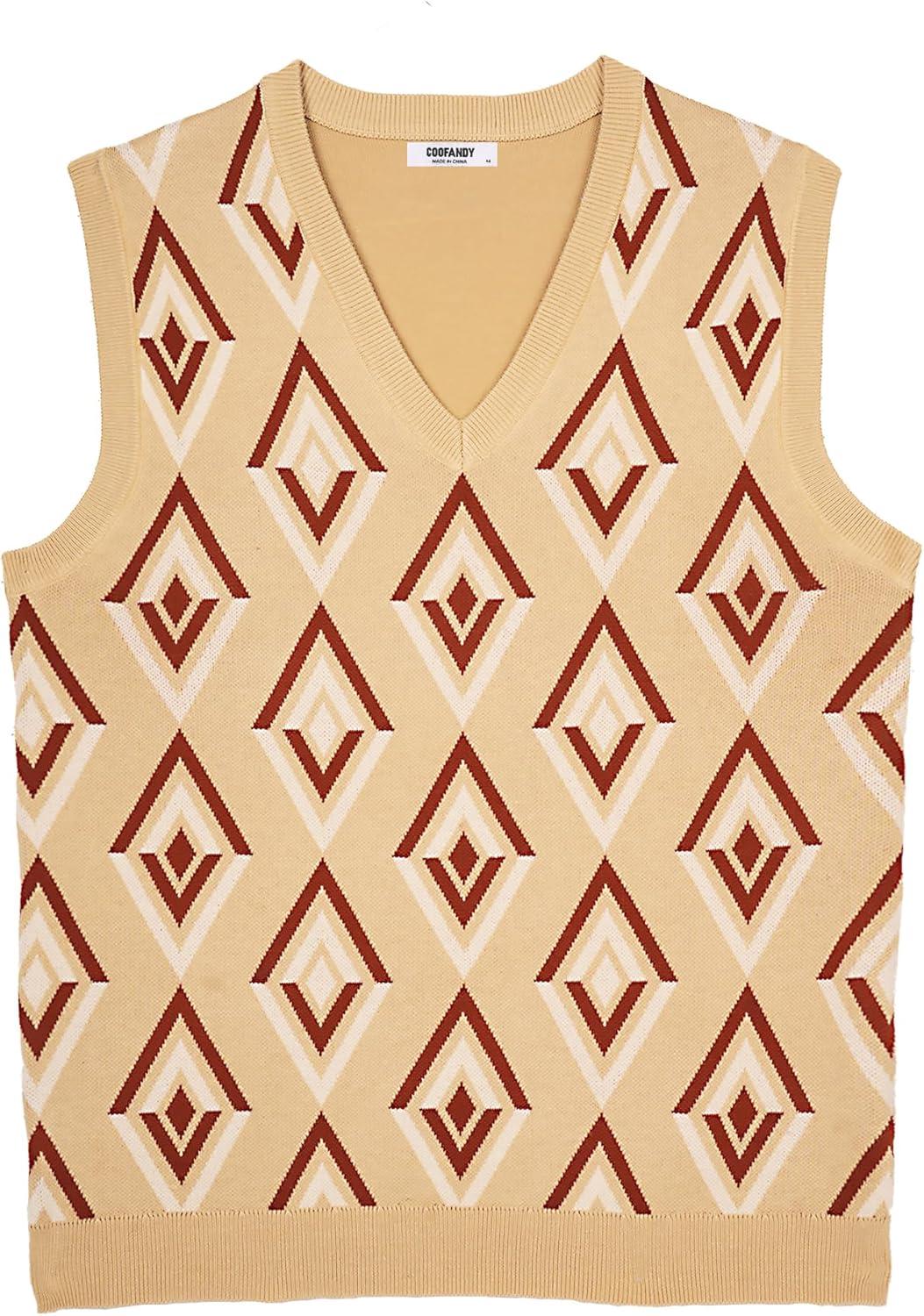 COOFANDY Men’s Sweater Vest V Neck Sleeveless Sweater Slim Fit Casual Knitted Vest Sweaters(Argyle Khaki)