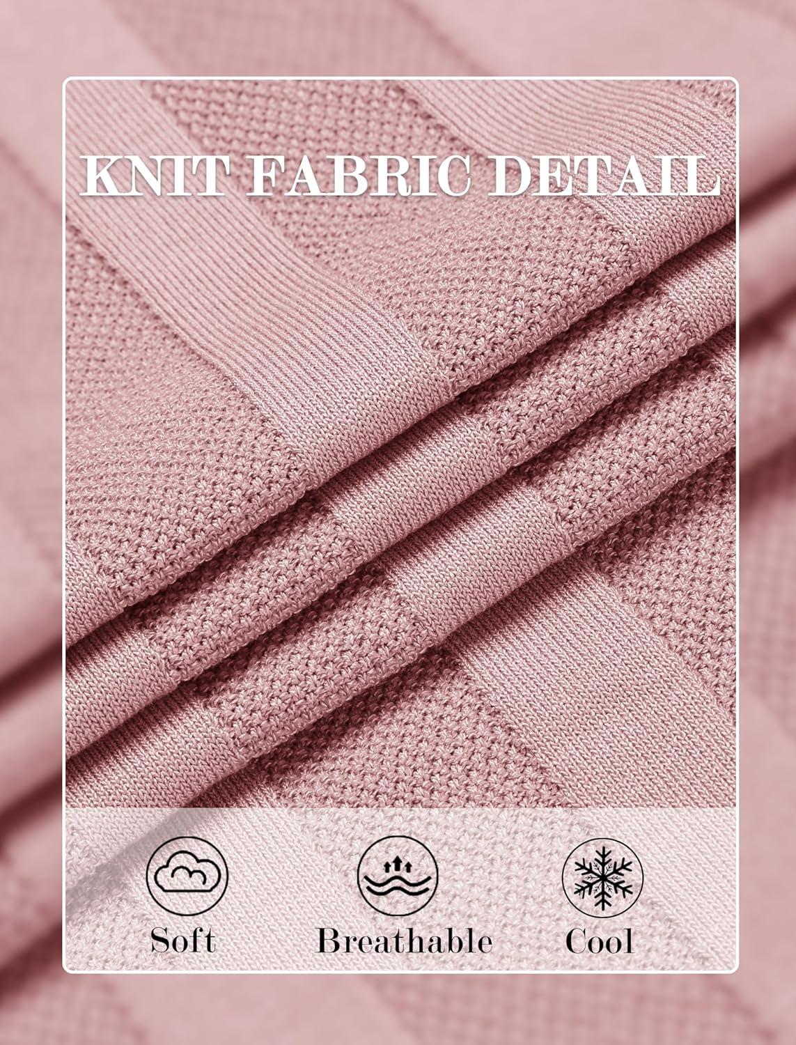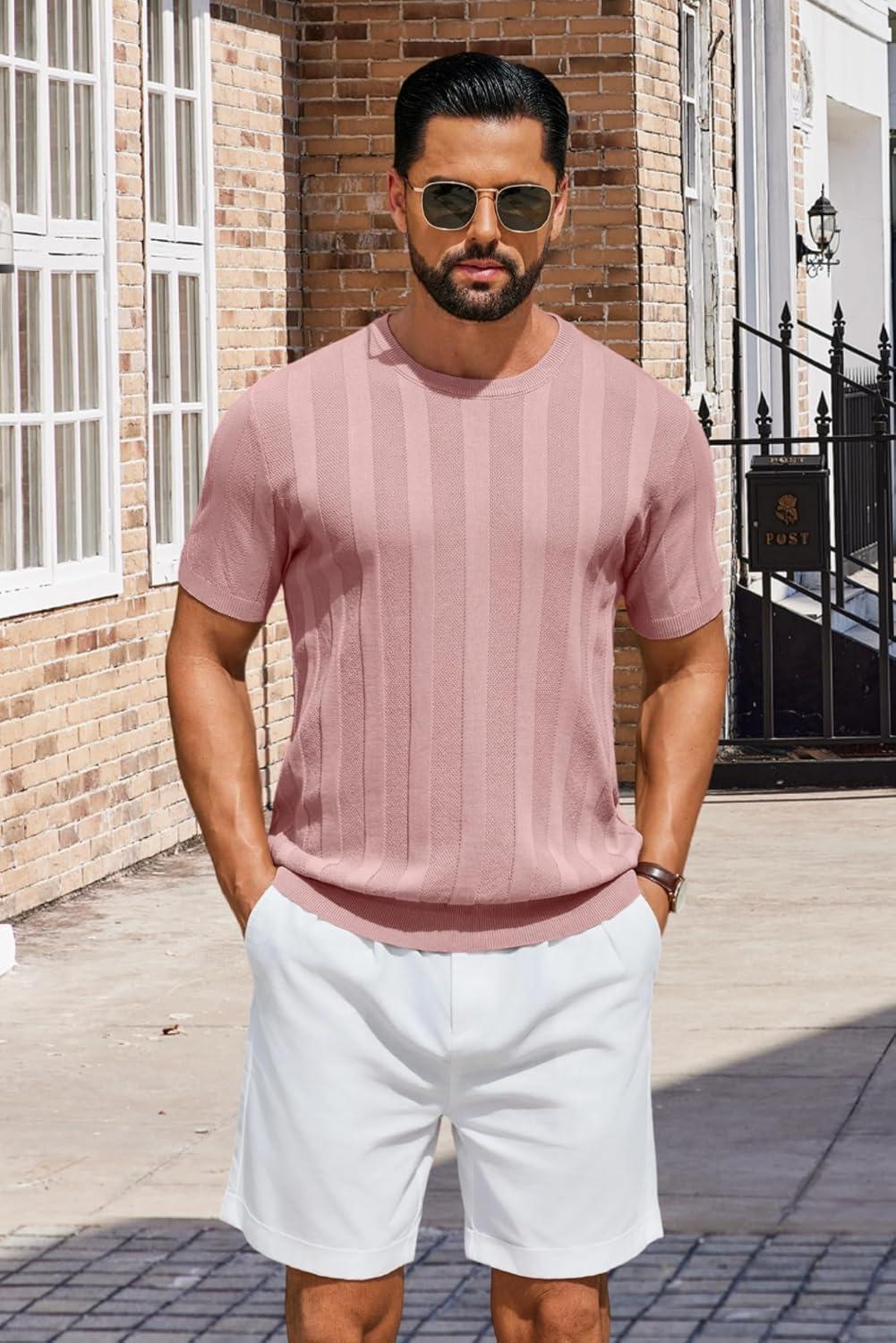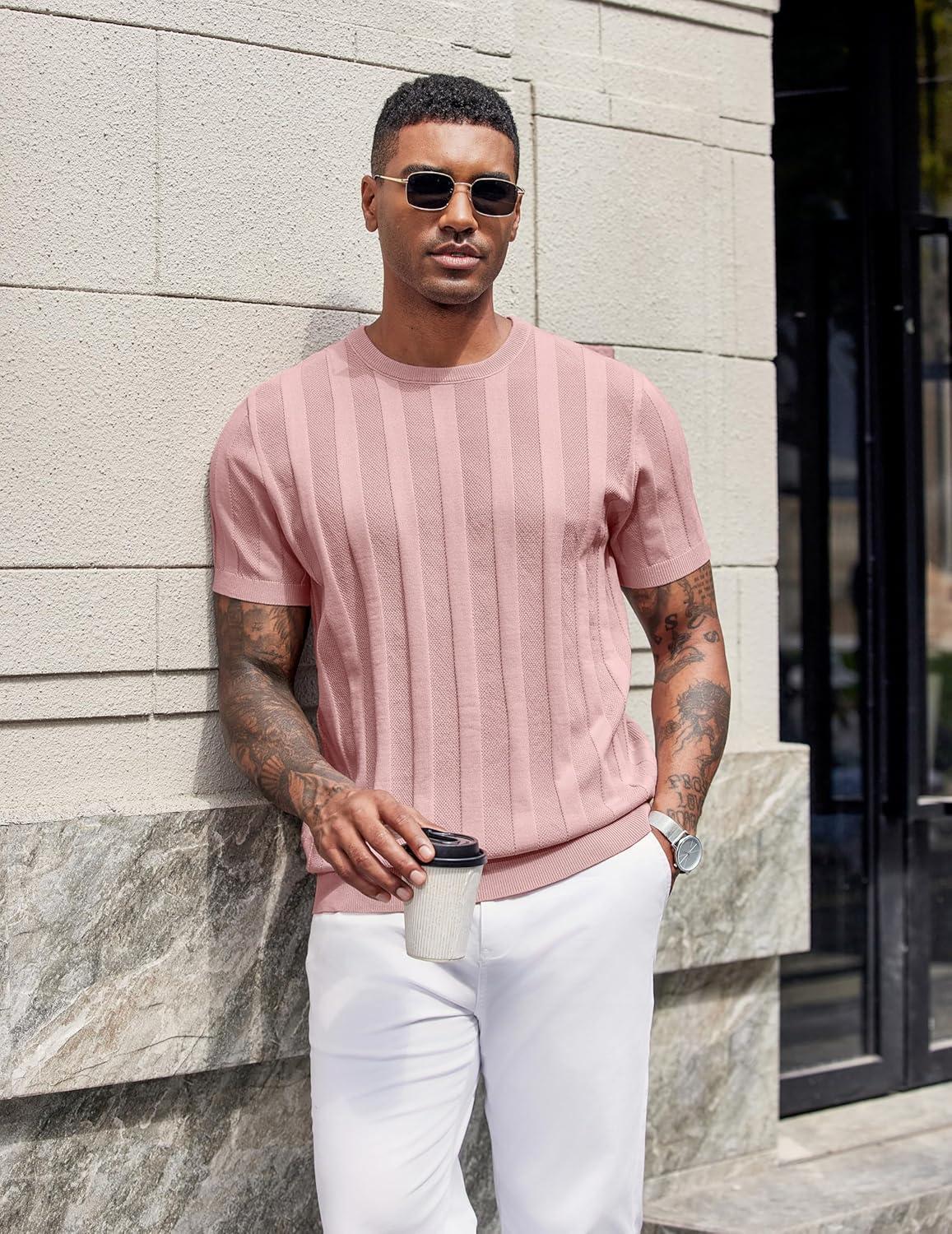 COOFANDY Mens T-Shirts Short Sleeve Knit Shirt Crew Neck Sweater Fashion Casual Textured Pullover Tees(Light Pink)