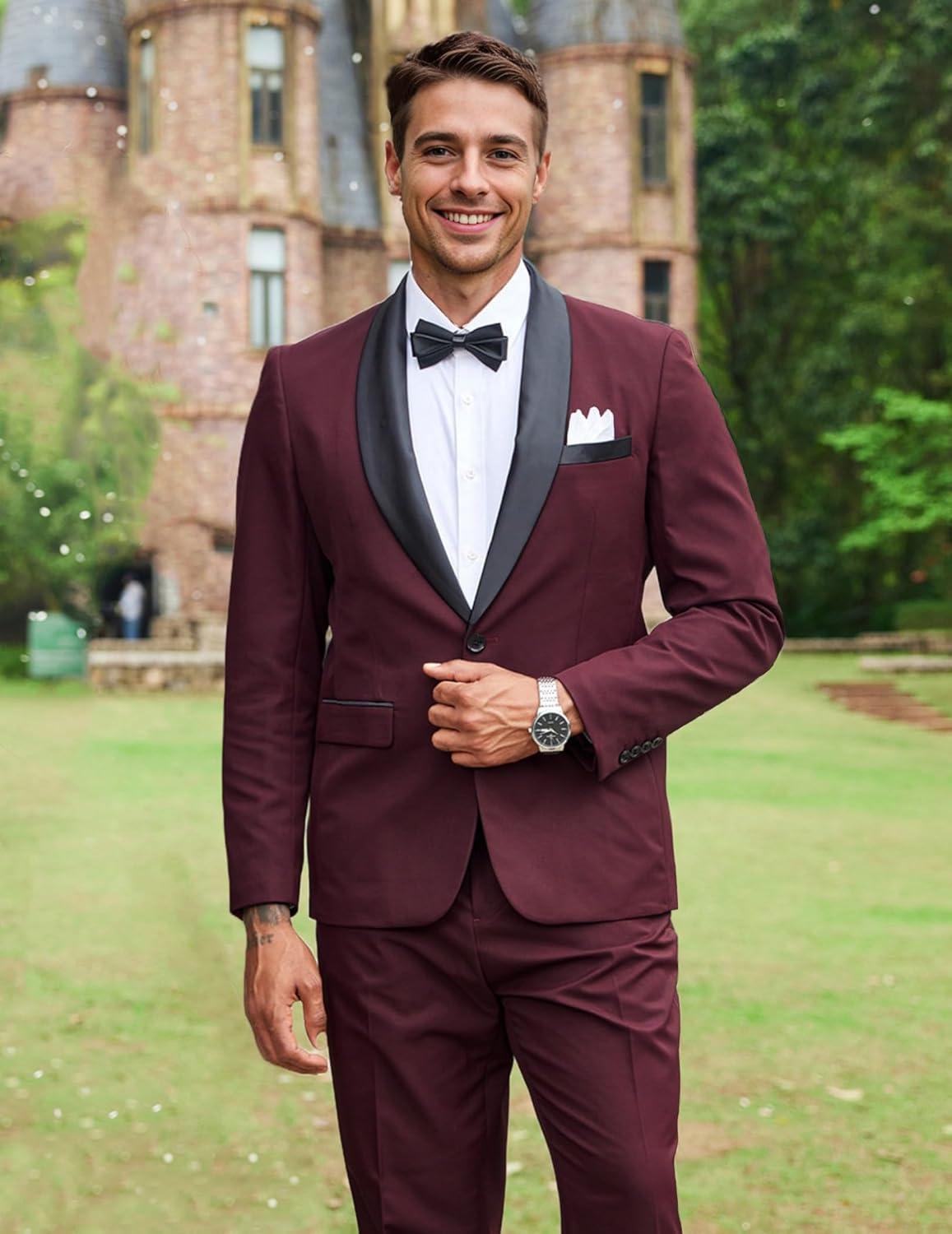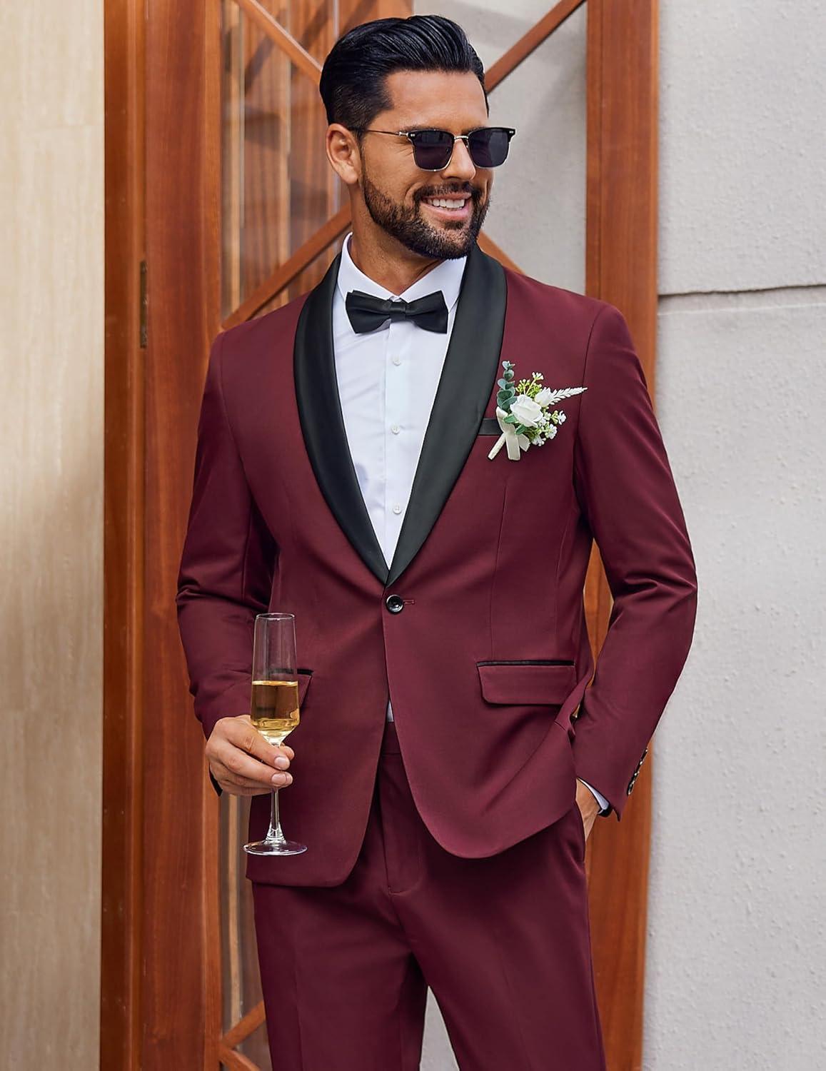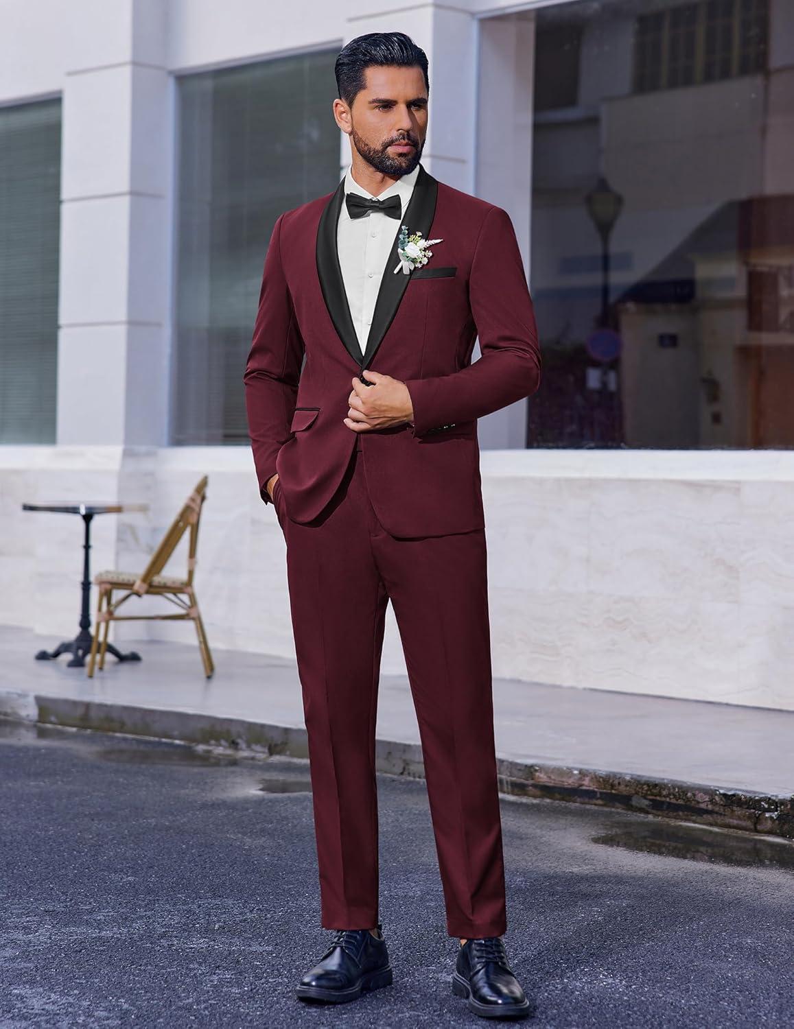 COOFANDY Mens Tuxedo Suit Set Slim Fit 2 Piece Dress Suit Shawl Lapel Tuxedo Jacket Pants for Wedding Dinner Prom Party(Wine Red)