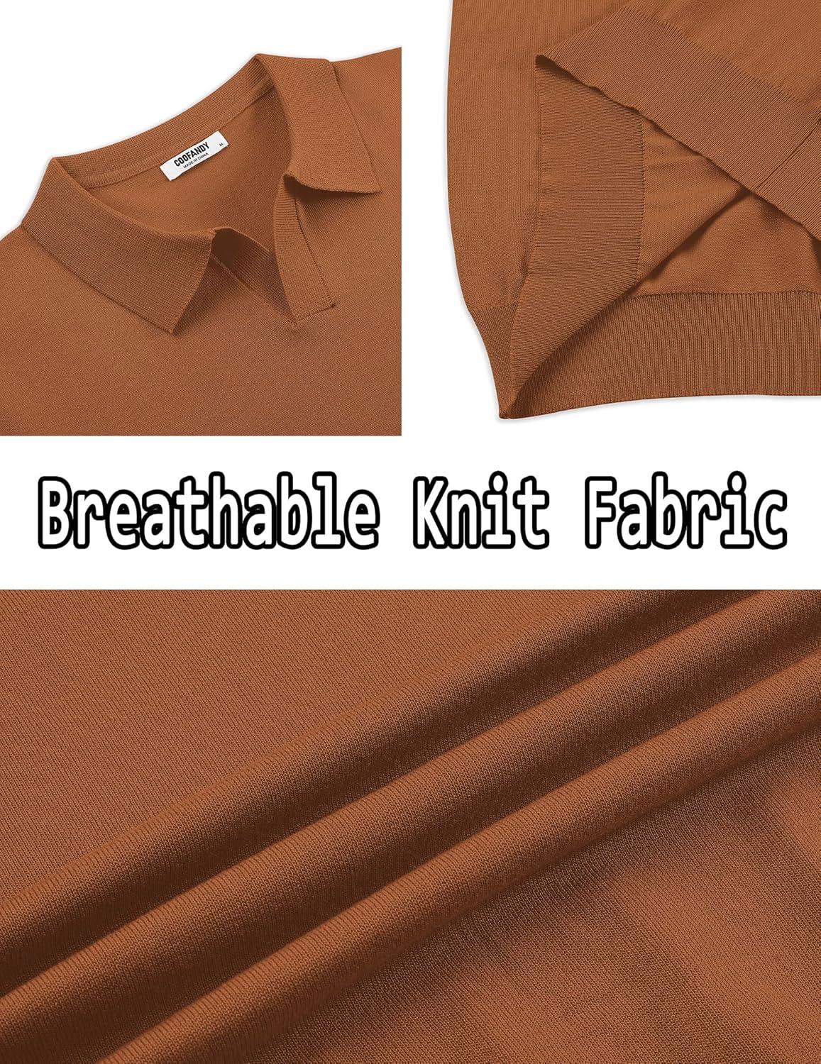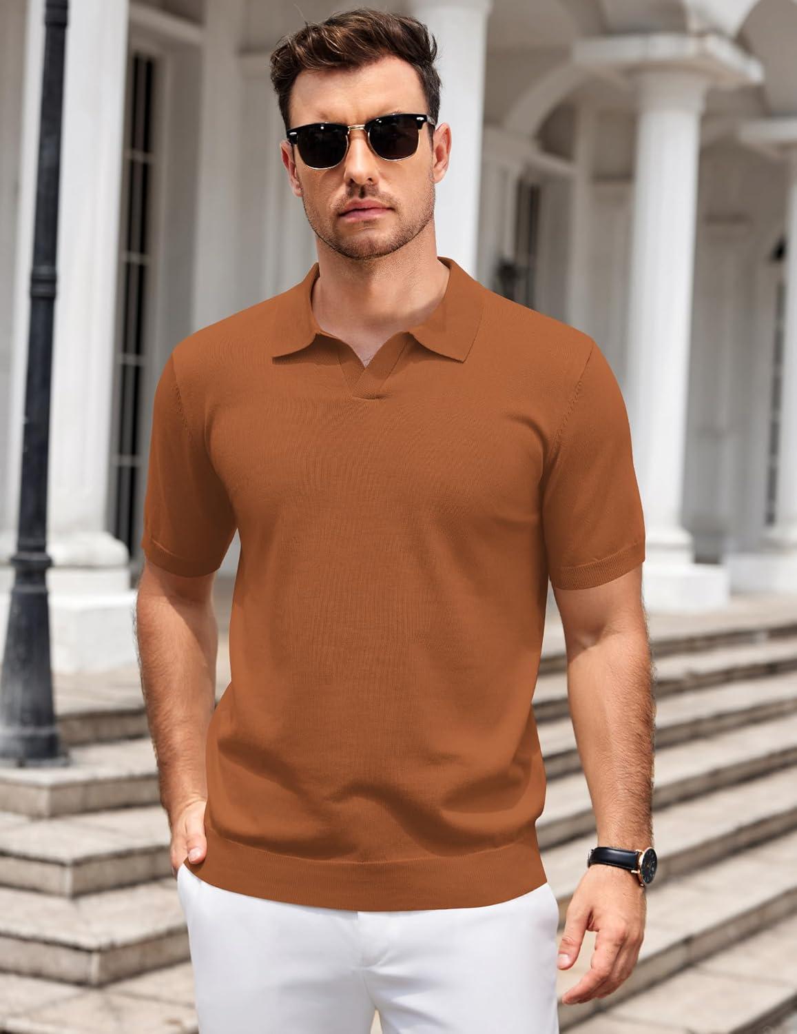 COOFANDY Men’s V Neck Short Sleeve Stretch Knit Polo Shirt(Caramel)