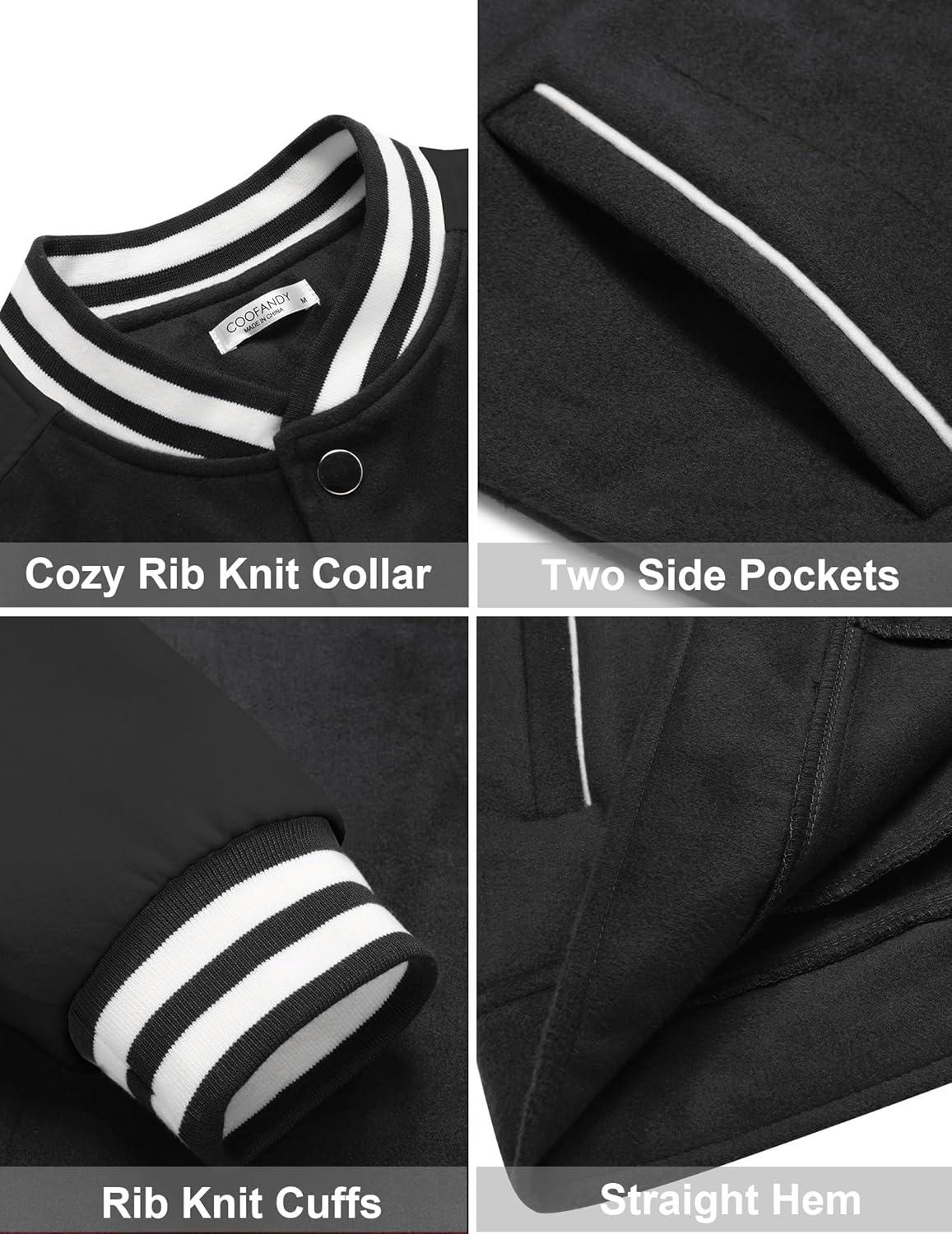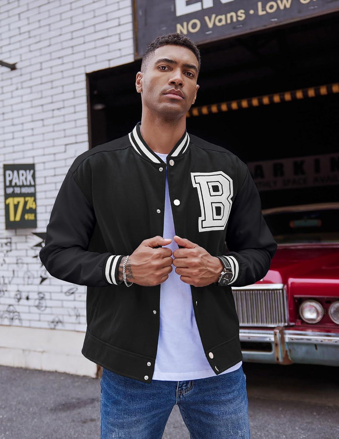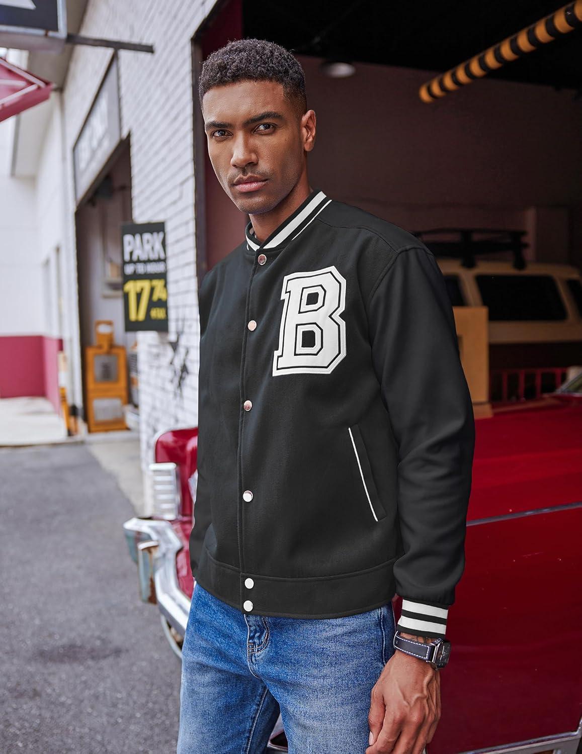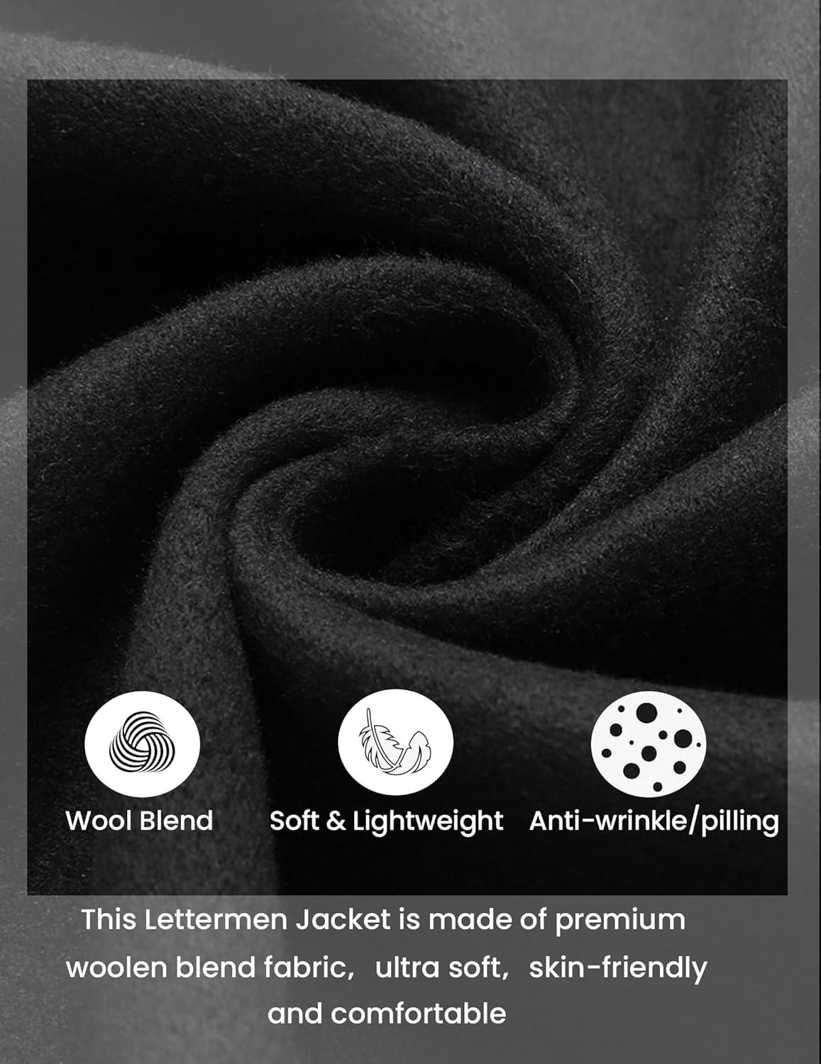 COOFANDY Men’s Varsity Jacket Wool Blend Letterman Bomber Jacket Baseball Lightweight Jacket(Pure Black)