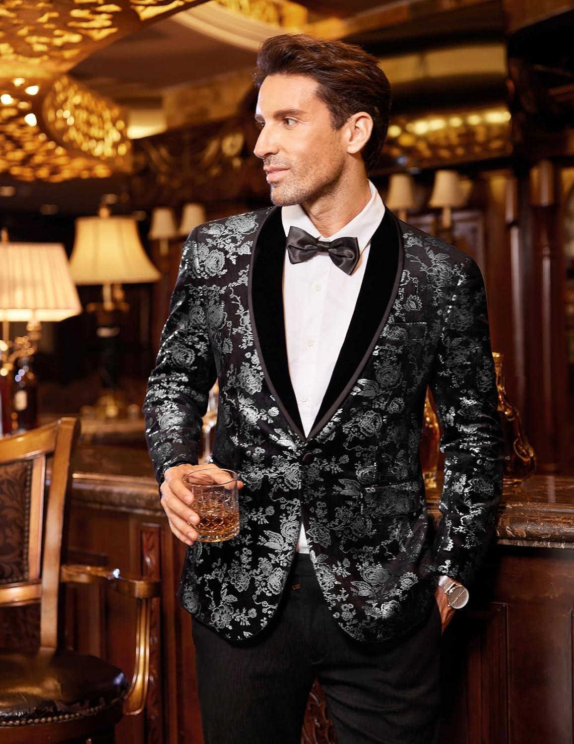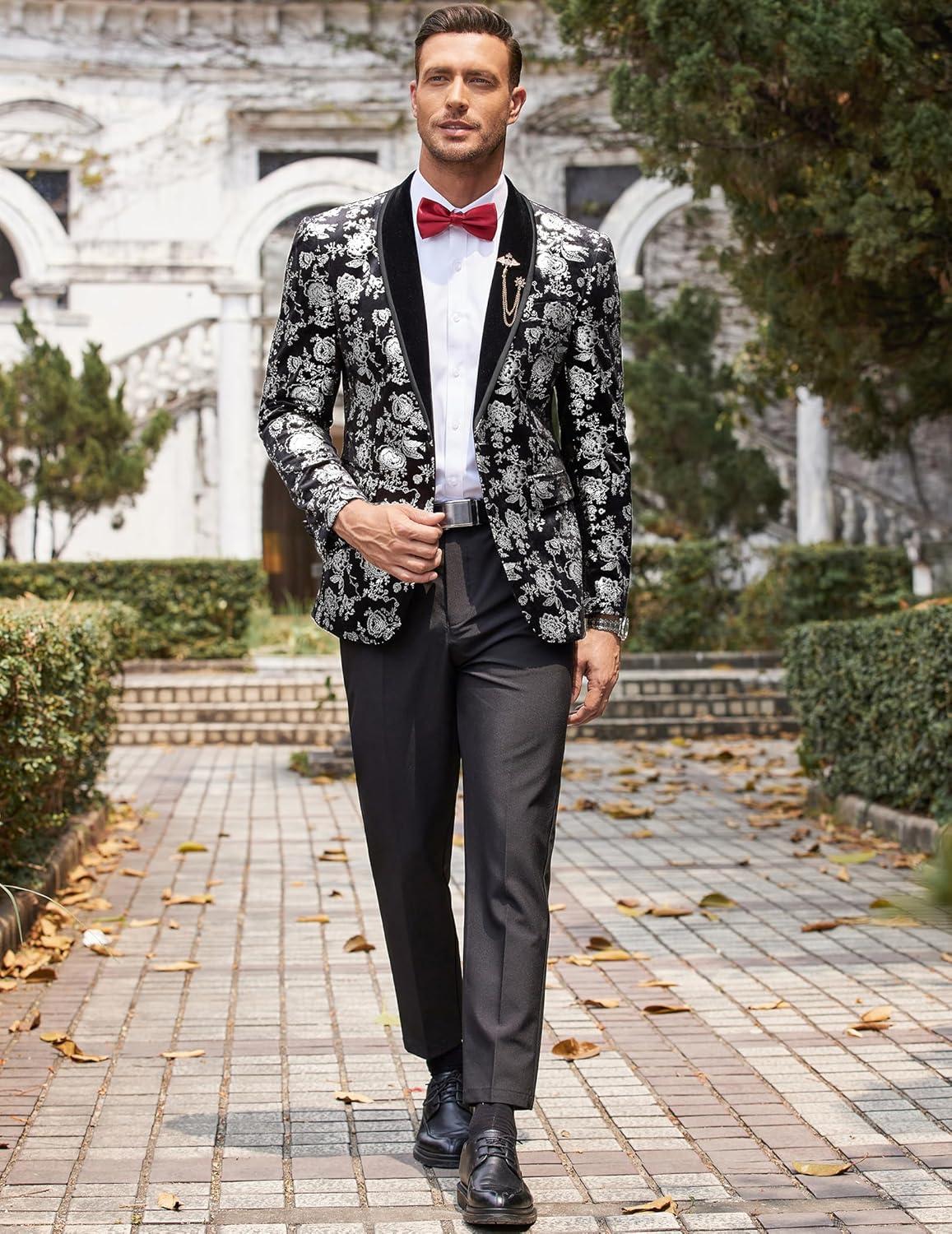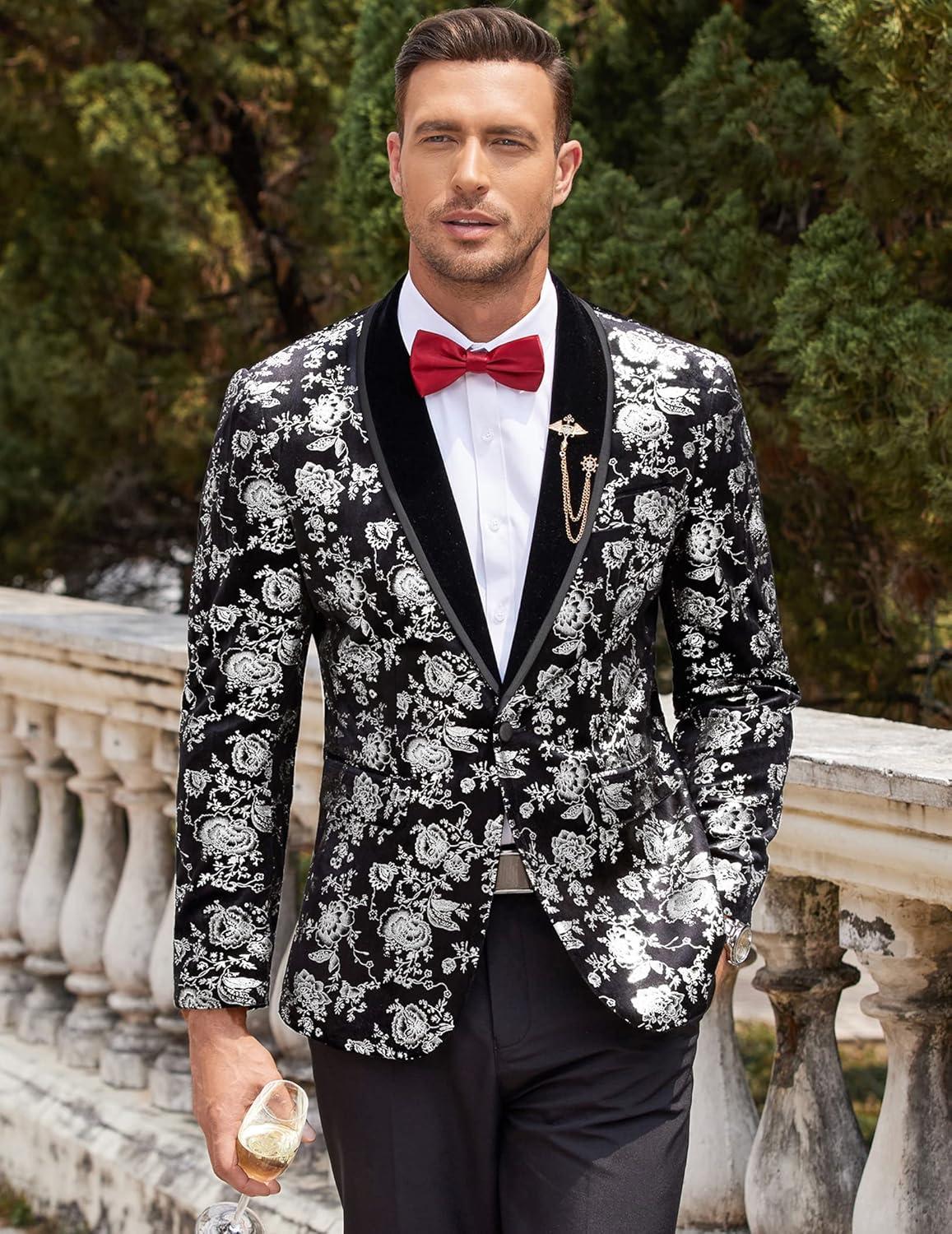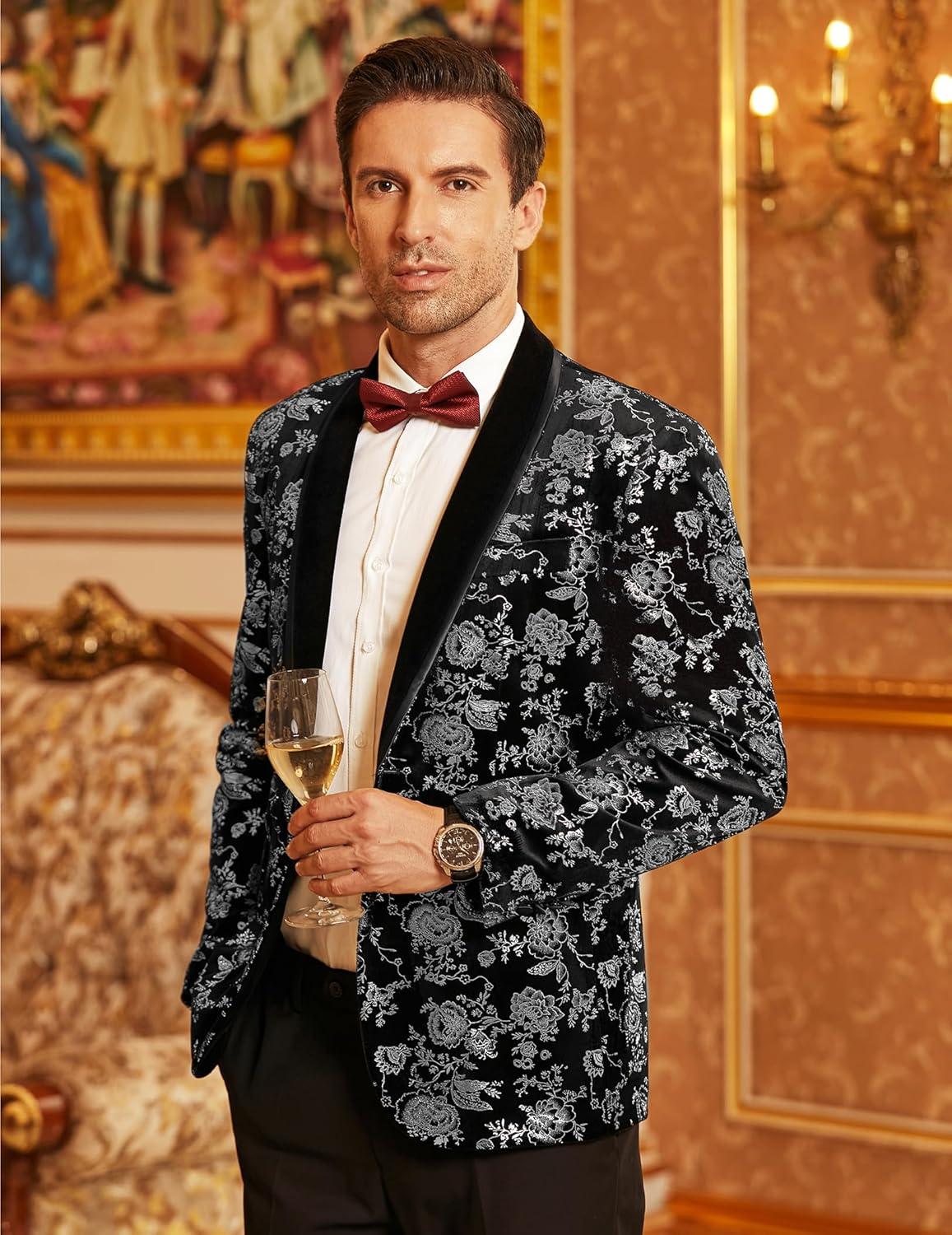 COOFANDY Men’s Velvet Tuxedo Floral Blazer Jacket One Button Shawl Lapel Suit Jacket for Dinner Prom Party Wedding(Silver)