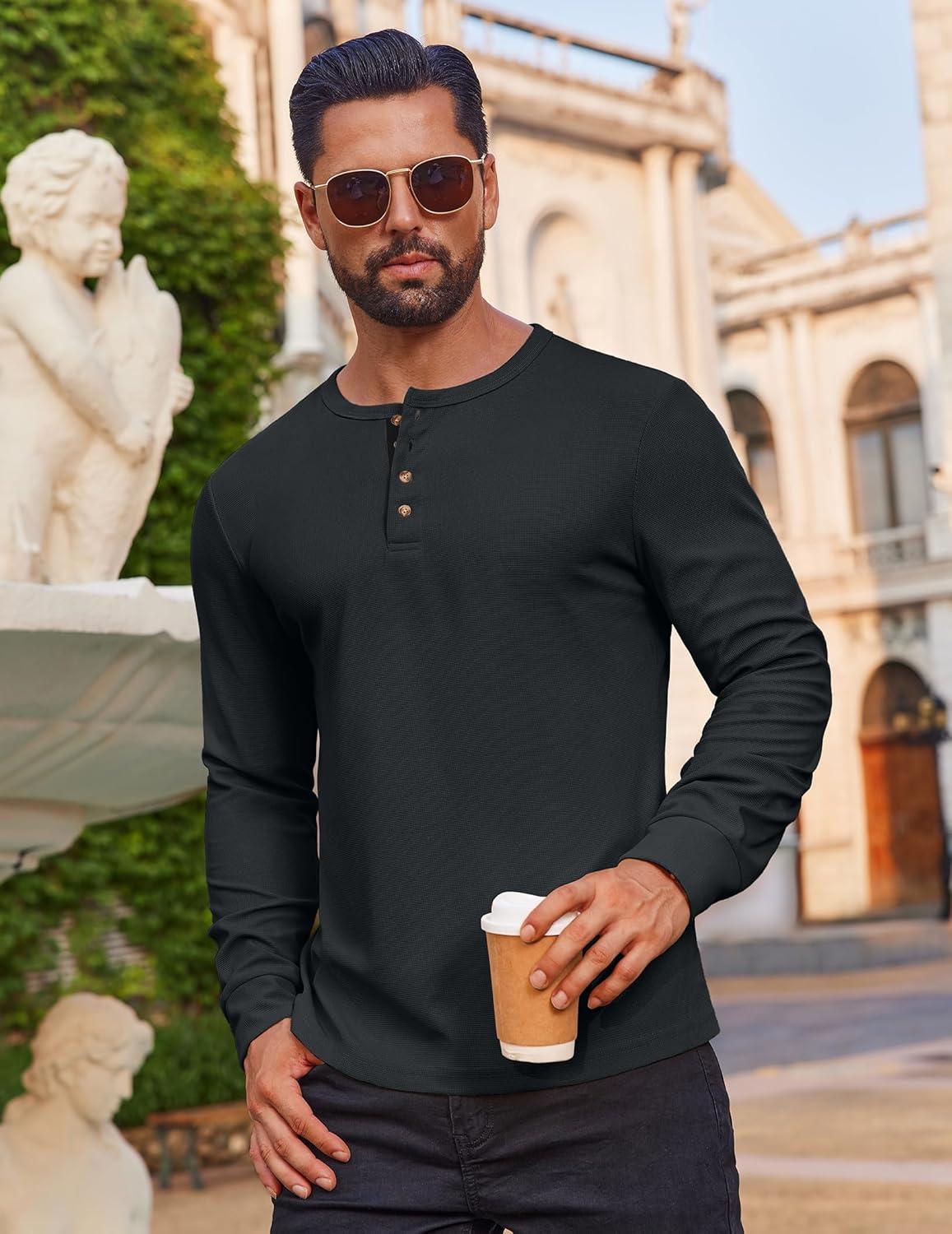 COOFANDY Mens Waffle Henley Shirts Long Sleeve Casual T-Shirt Basic Lightweight Pullover Tees(Brown)