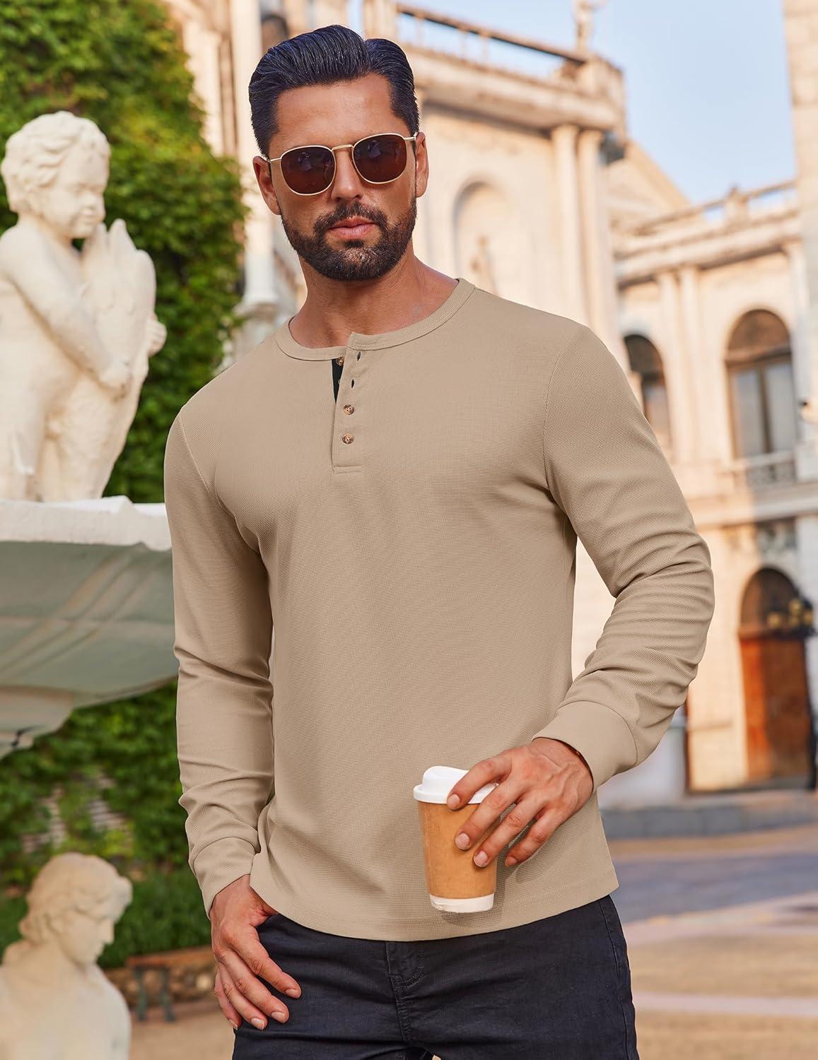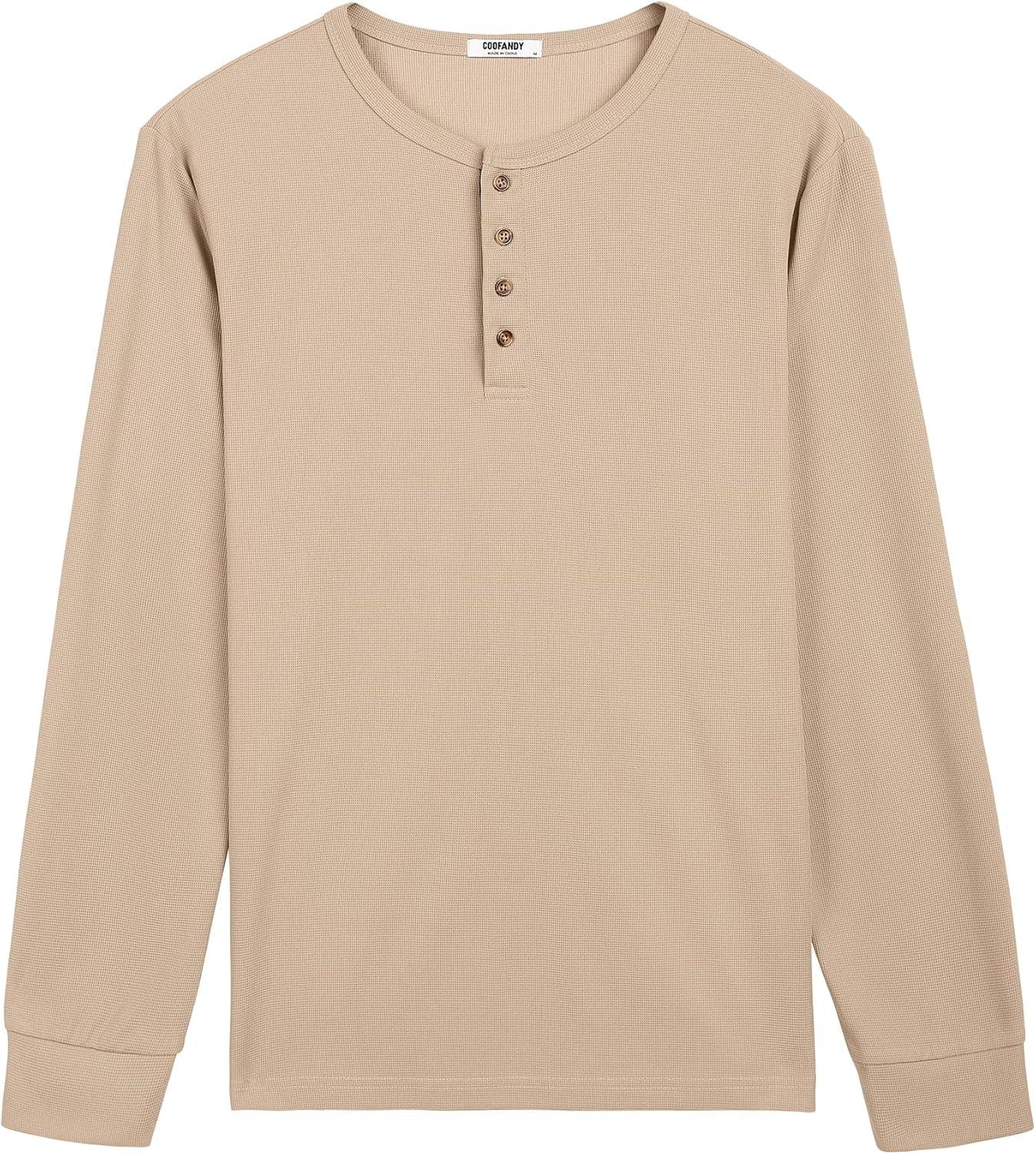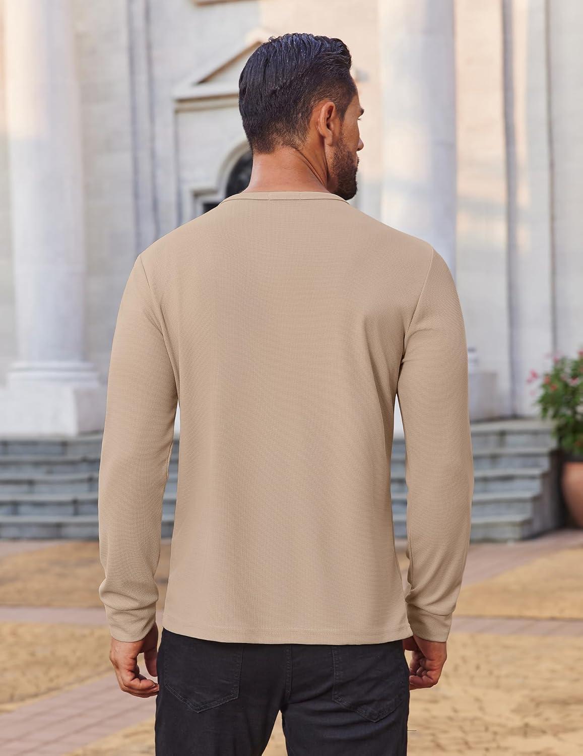 COOFANDY Mens Waffle Henley Shirts Long Sleeve Casual T-Shirt Basic Lightweight Pullover Tees(Khaki)