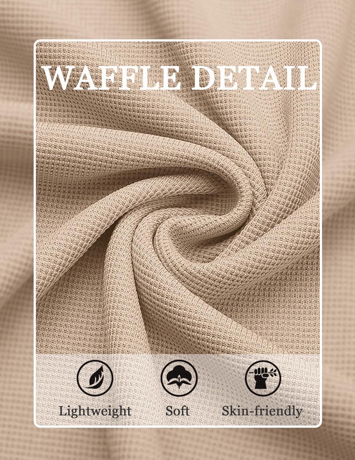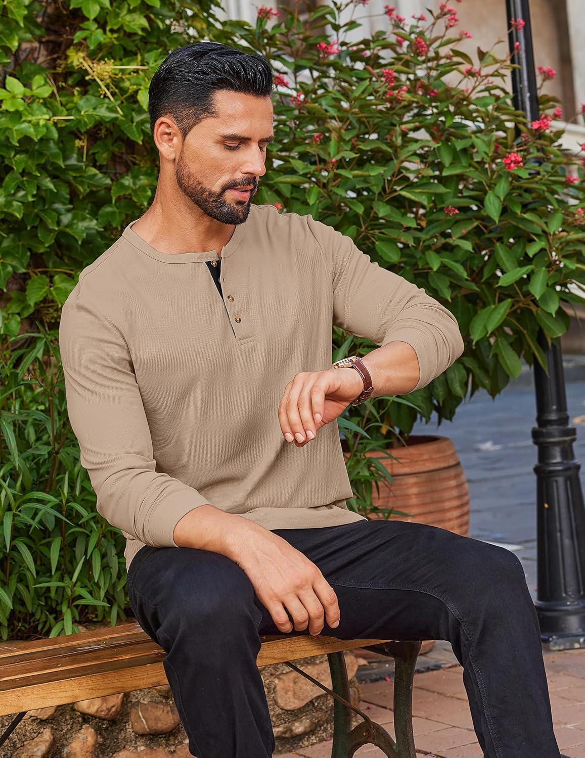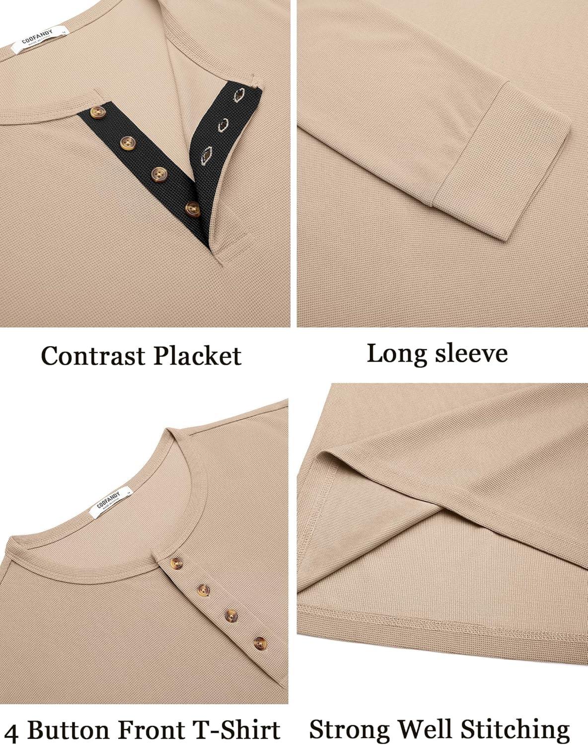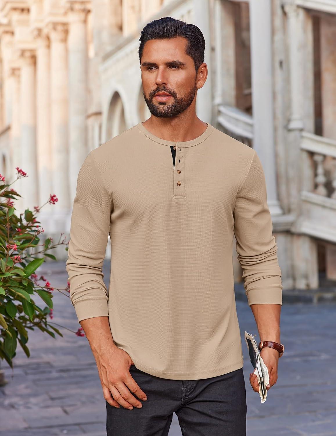 COOFANDY Mens Waffle Henley Shirts Long Sleeve Casual T-Shirt Basic Lightweight Pullover Tees(Khaki)