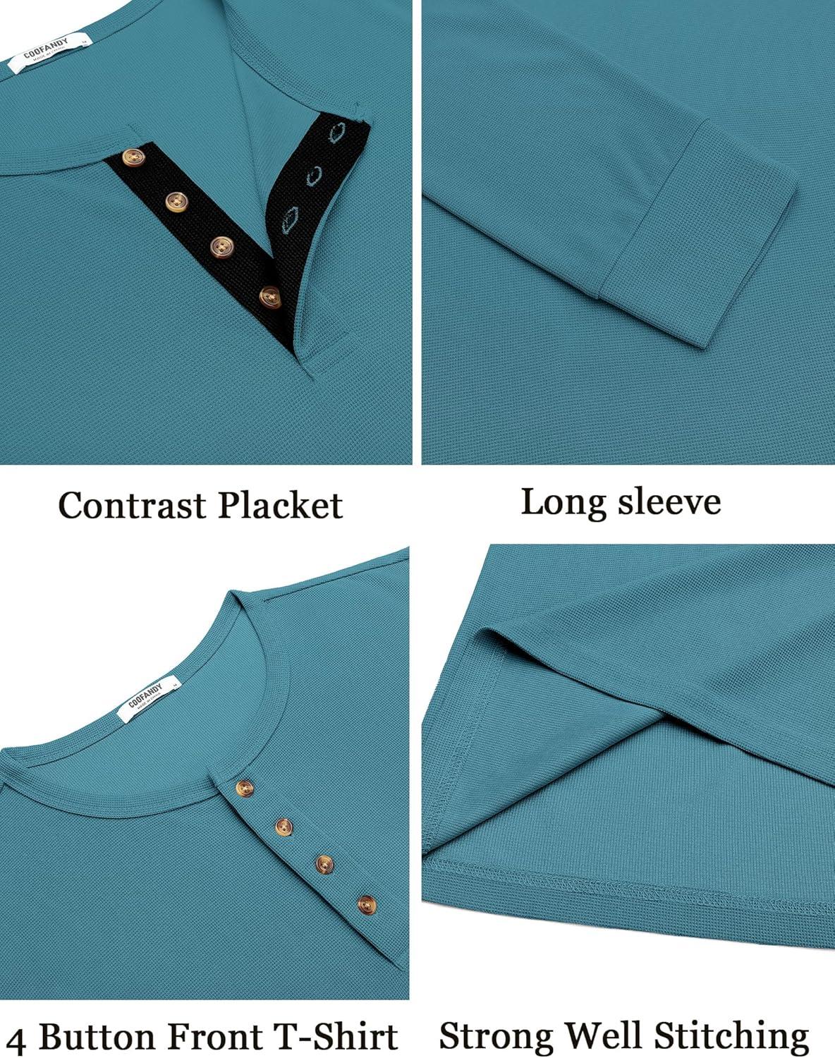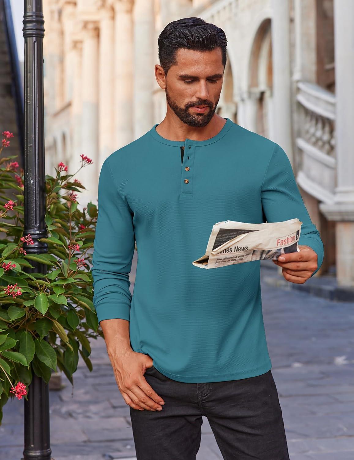COOFANDY Mens Waffle Henley Shirts Long Sleeve Casual T-Shirt Basic Lightweight Pullover Tees(Peacock Blue)