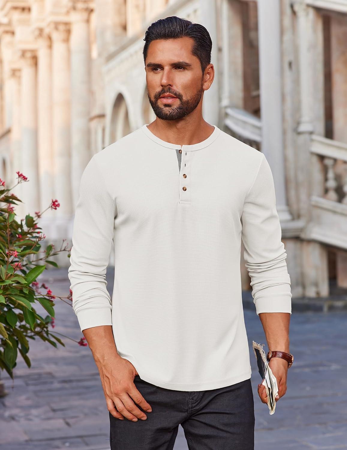 COOFANDY Mens Waffle Henley Shirts Long Sleeve Casual T-Shirt Basic Lightweight Pullover Tees(White)