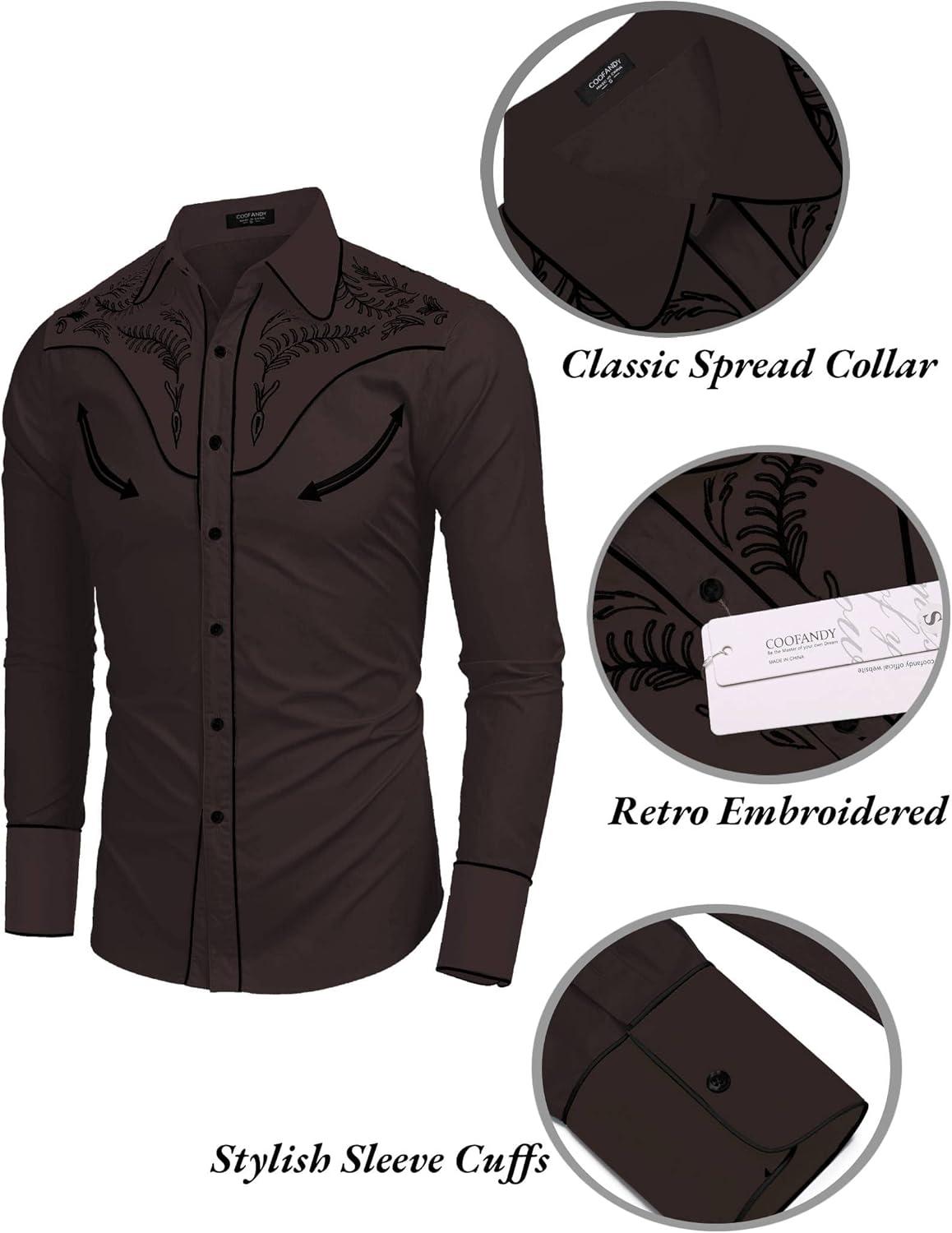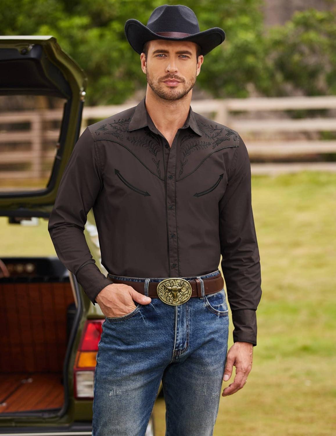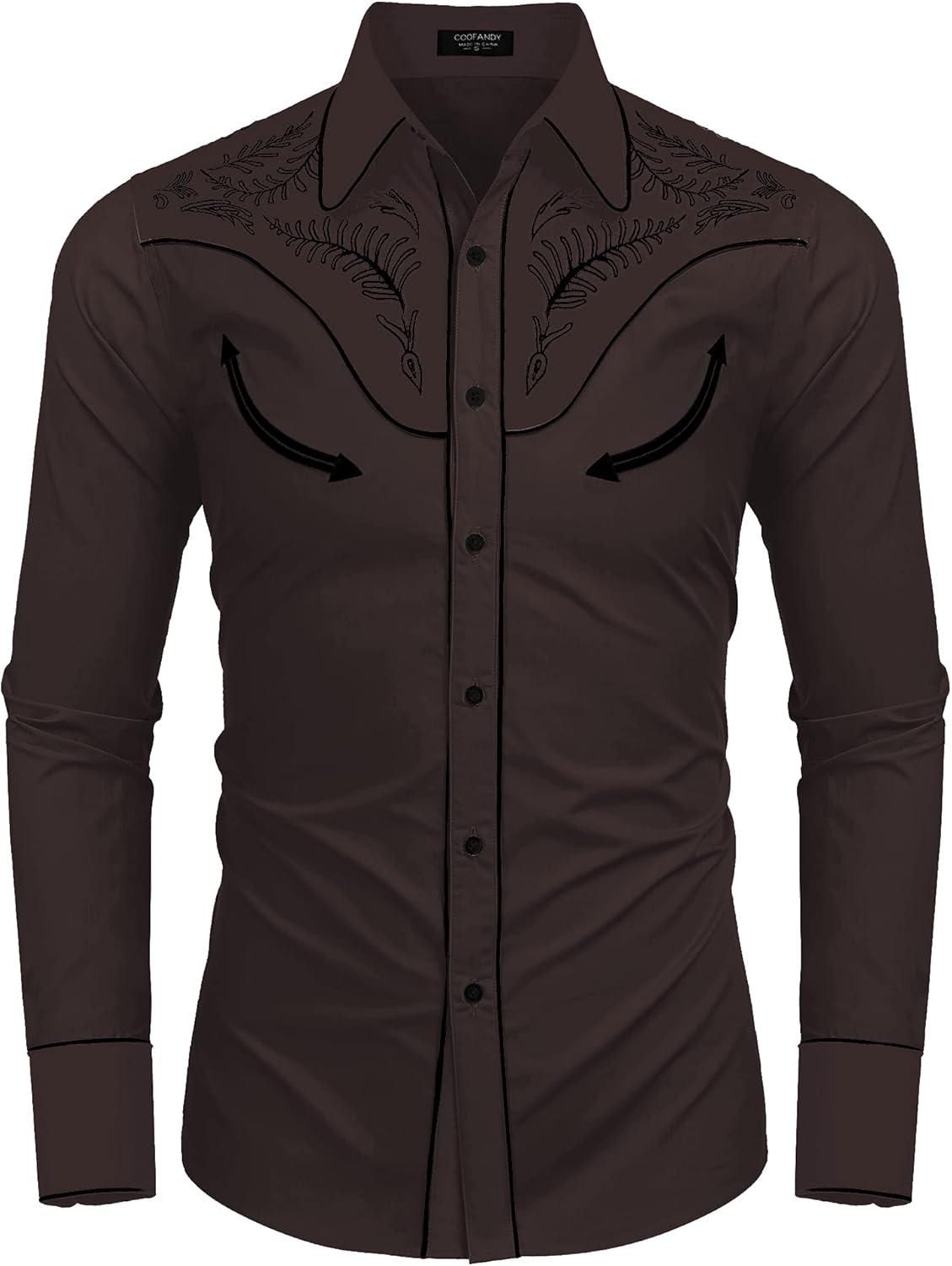COOFANDY Men’s Western Cowboy Shirt Embroidered Button Down Long Sleeve Shirts(Cotton – Dark Brown)