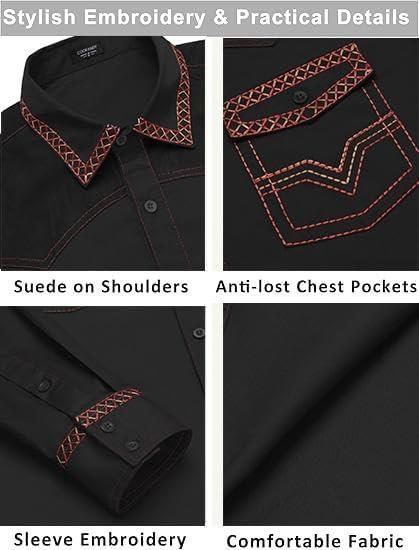 COOFANDY Men’s Western Cowboy Shirt Embroidered Long Sleeve Slim Fit Casual Cotton Button Down Hippie Shirts with Pockets(Black& Dark Brown)