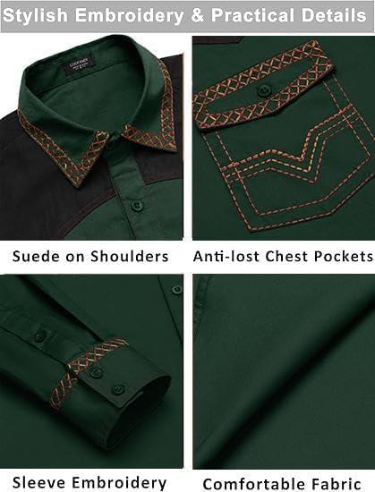 COOFANDY Men’s Western Cowboy Shirt Embroidered Long Sleeve Slim Fit Casual Cotton Button Down Hippie Shirts with Pockets(Lake Green)