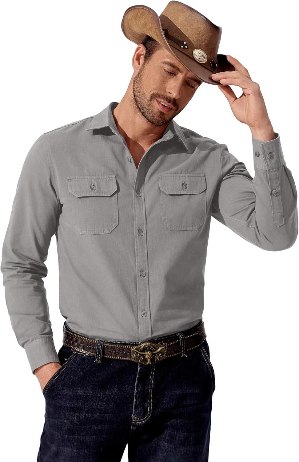 COOFANDY Mens Western Cowboy Shirt Long Sleeve Cotton Button Down Work Shirts with Pockets(Light Grey)