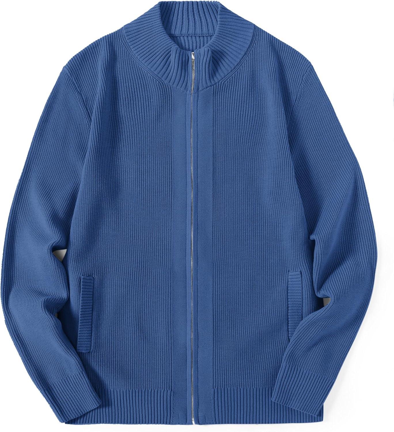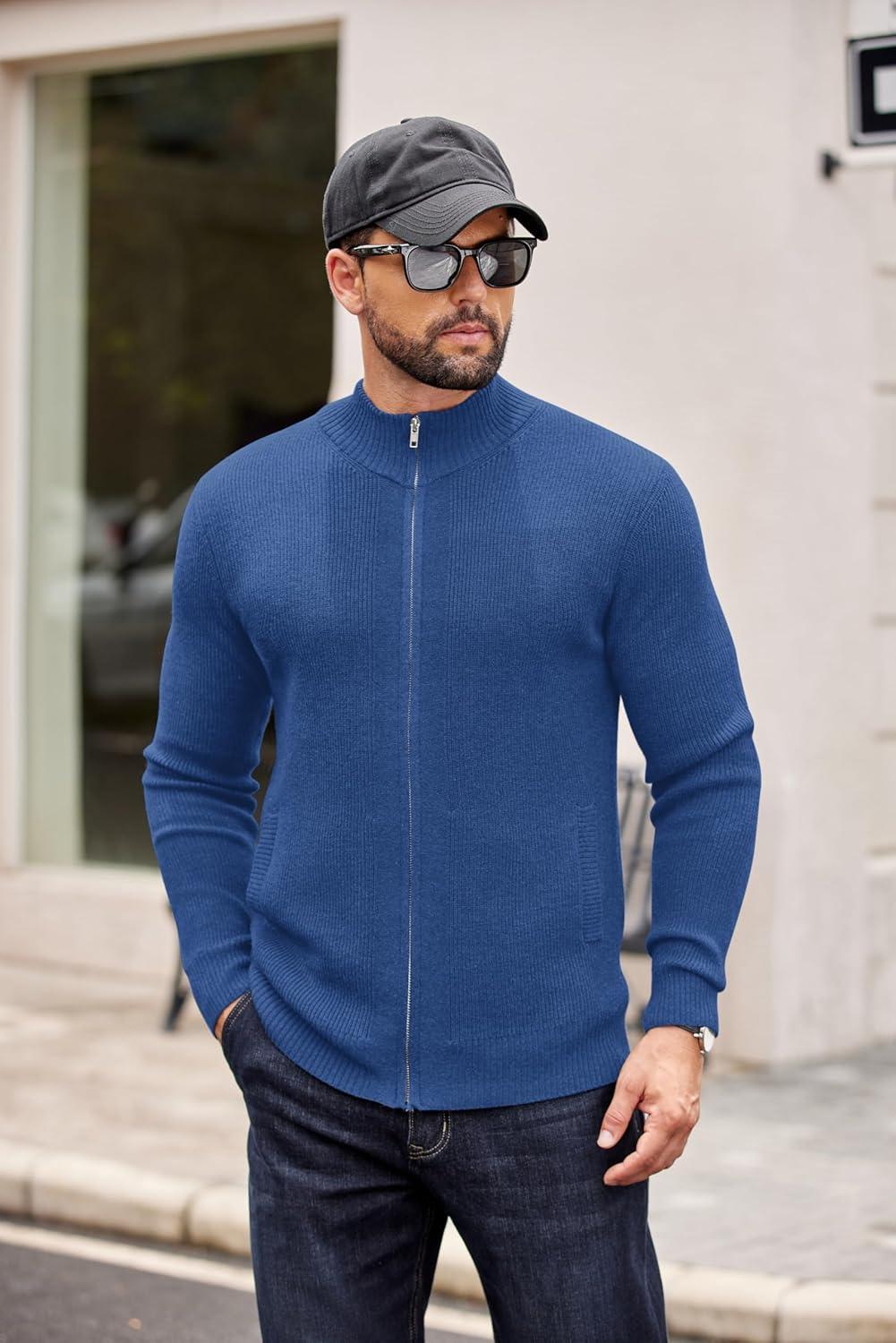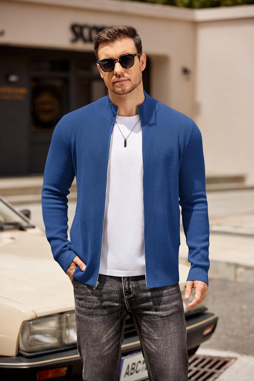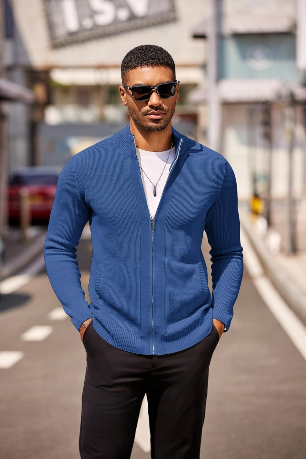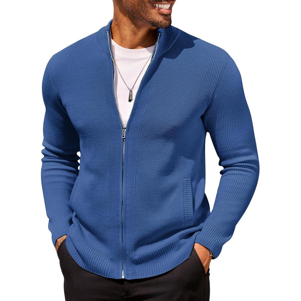 COOFANDY Mens Zip Up Cardigan Sweater Slim Fit Casual Full Zip Sweaters Knit Stand Collar Cardigans with 2 Front Pockets(Blue)