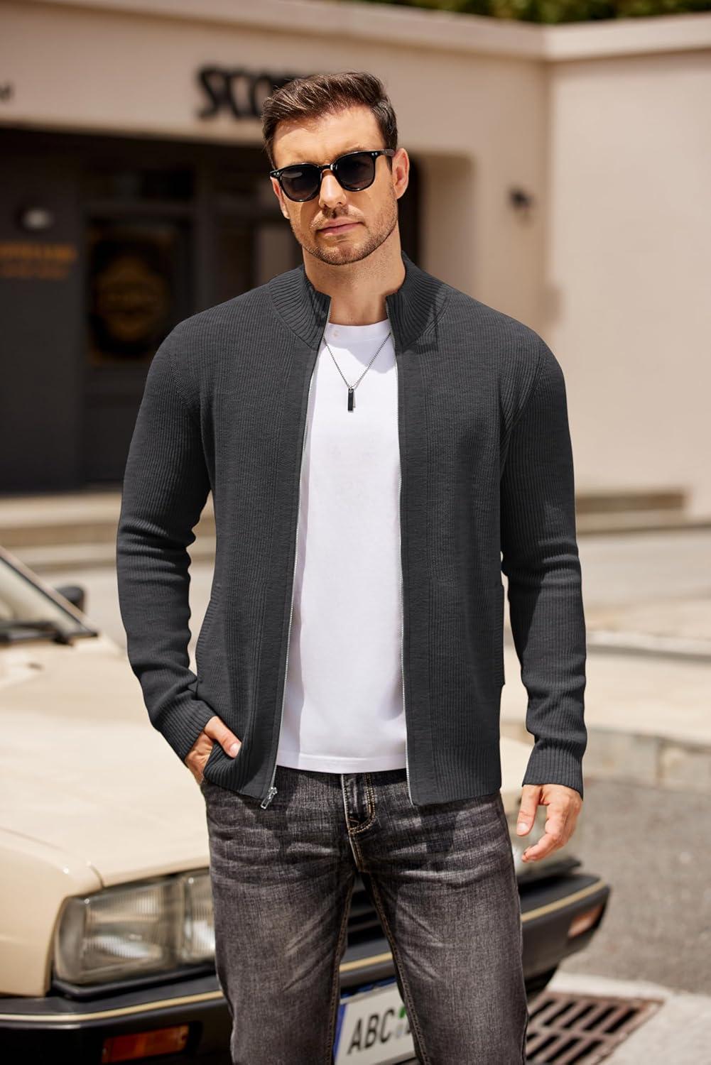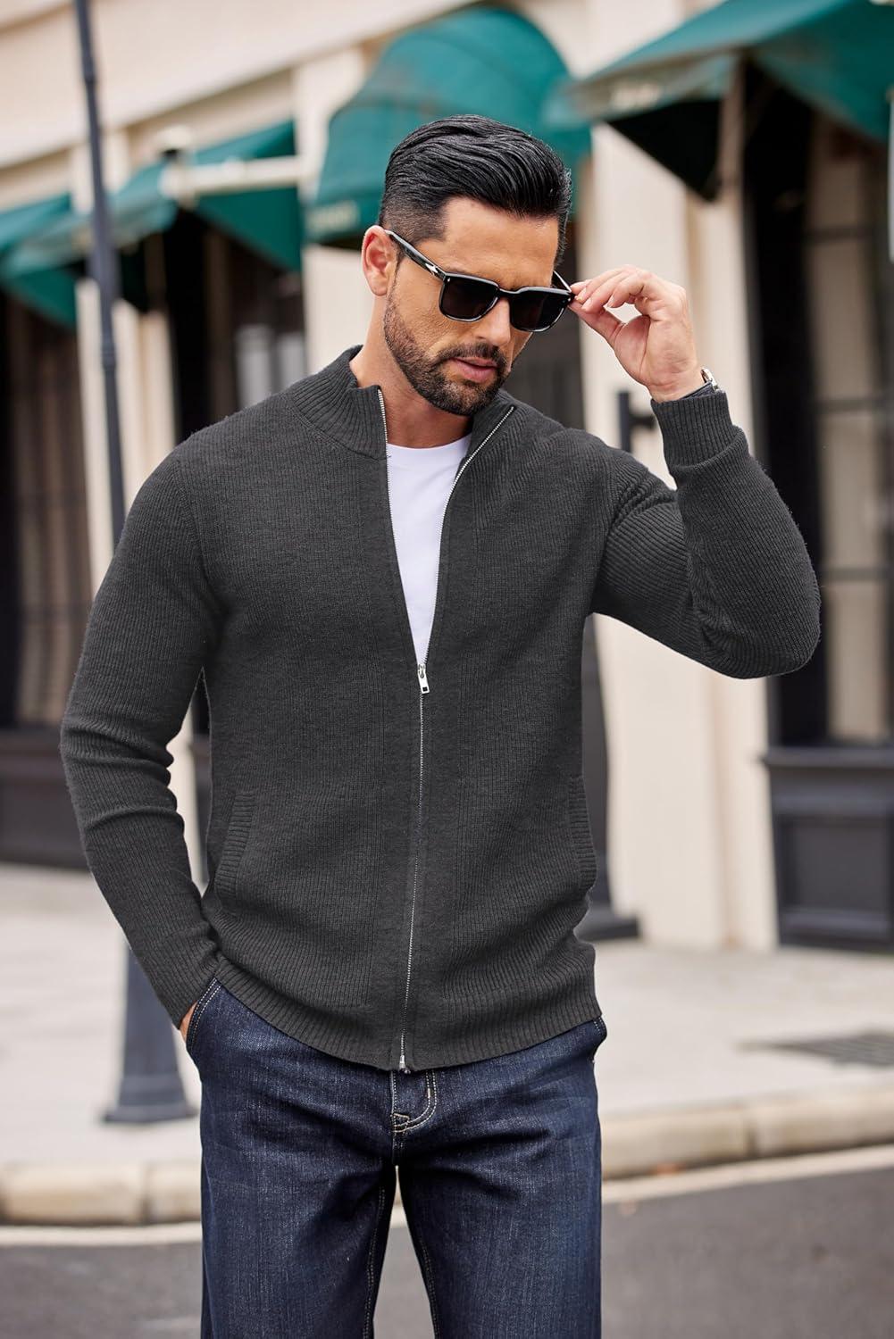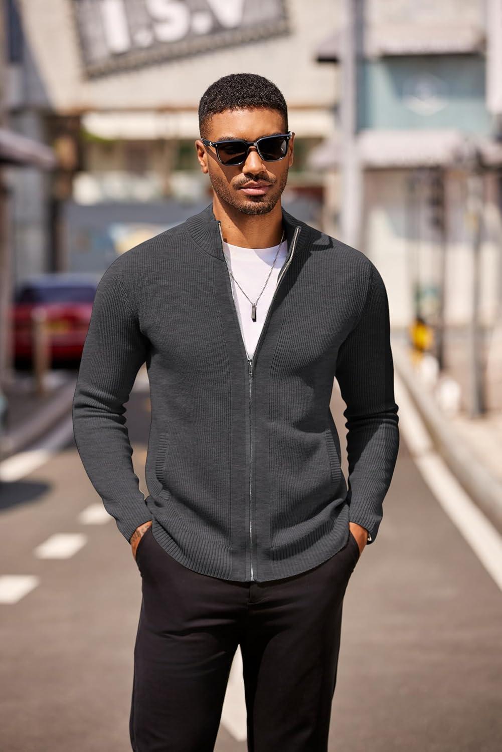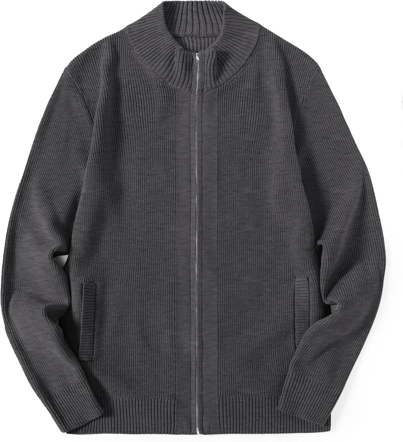 COOFANDY Mens Zip Up Cardigan Sweater Slim Fit Casual Full Zip Sweaters Knit Stand Collar Cardigans with 2 Front Pockets(Dark Gray)